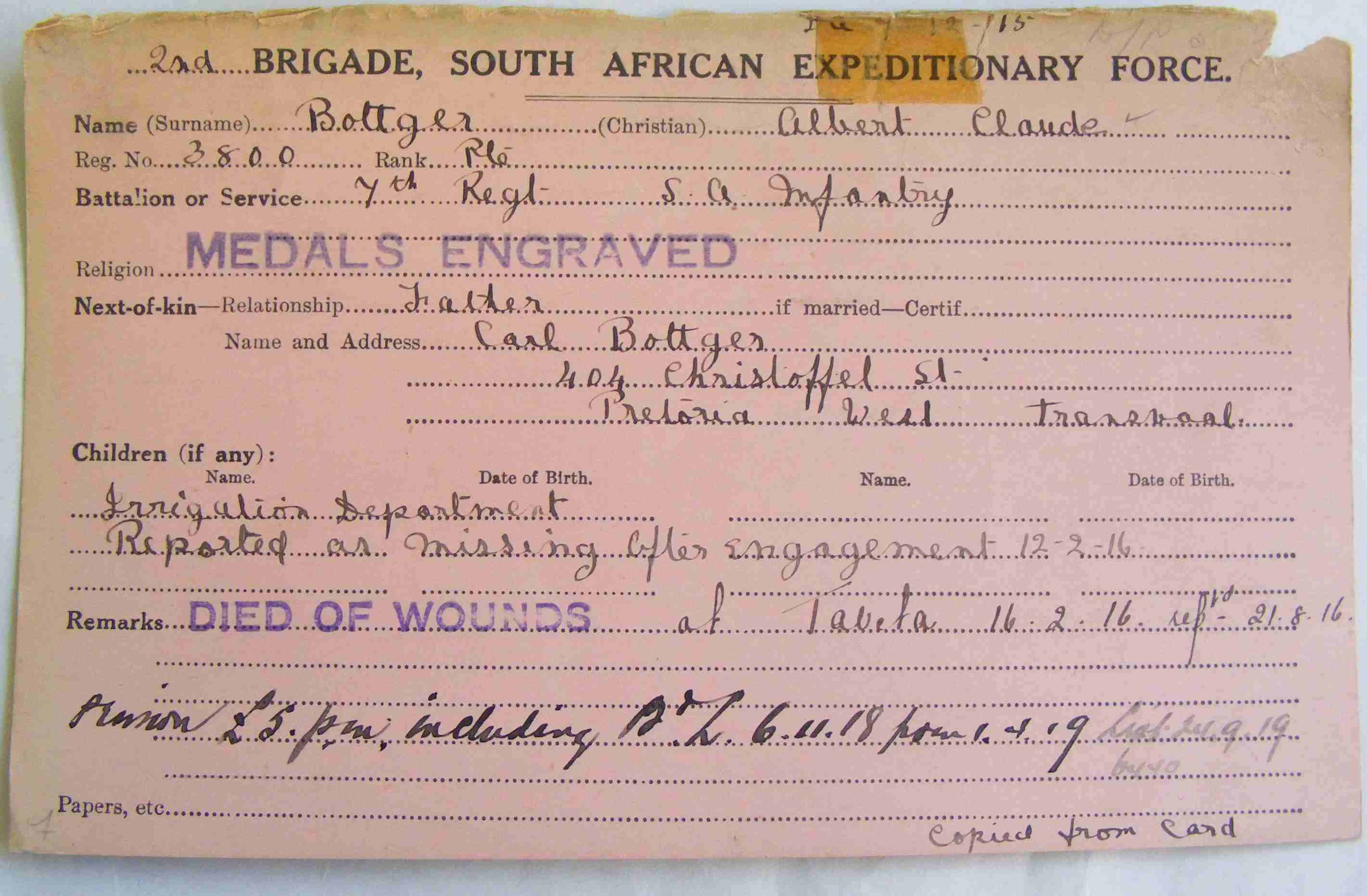 Son of Carl Henry and Edith Amelia Bottger, of 404 Christoffel Street, Pretoria West, Transvaal. Commemoration stone in Johannesburg (Brixton) Cemetery