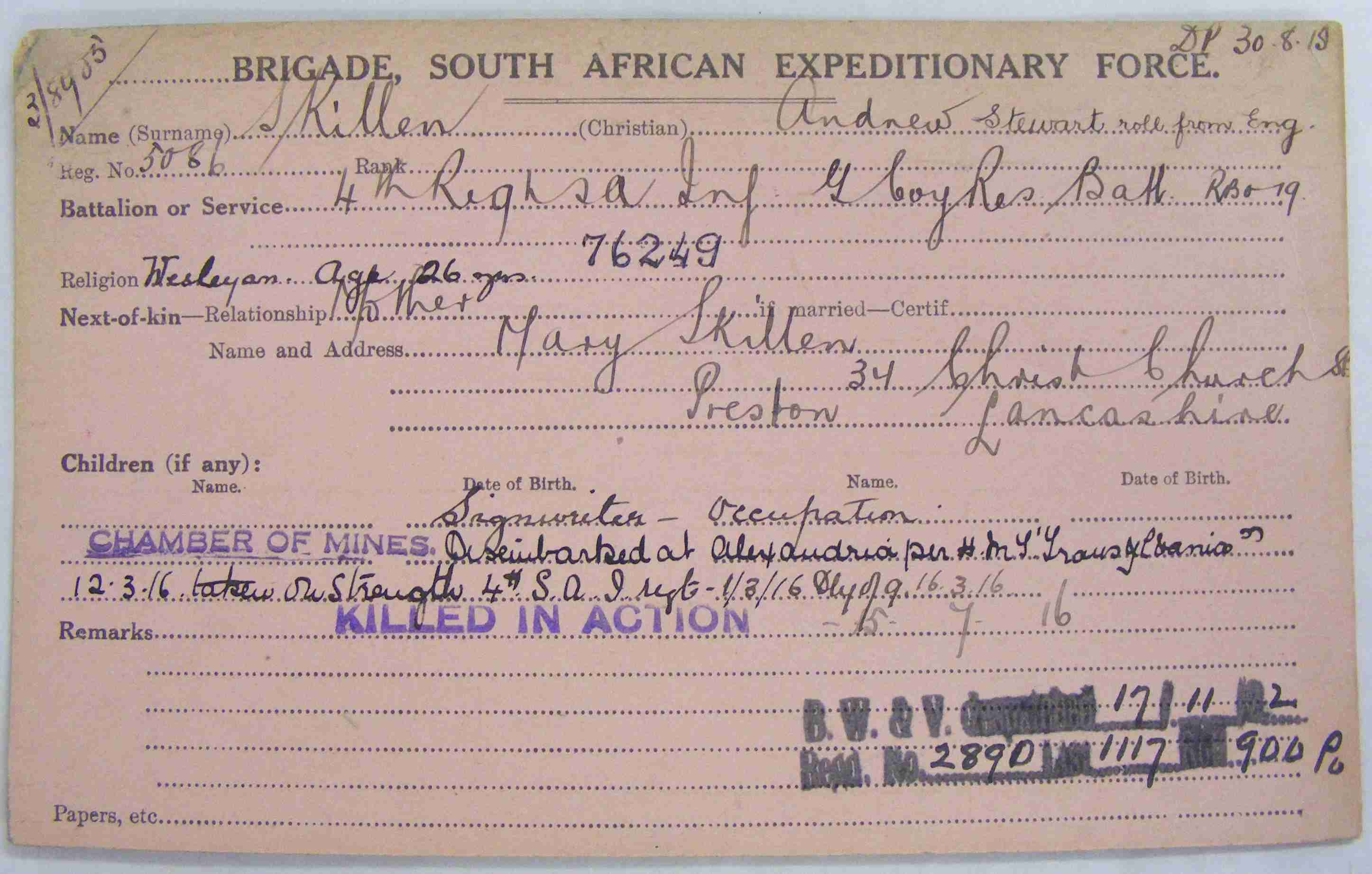 Son of Mrs. Mary Skillen, of 228A, Fawcus St., Jeppes Extension, Johannesburg.