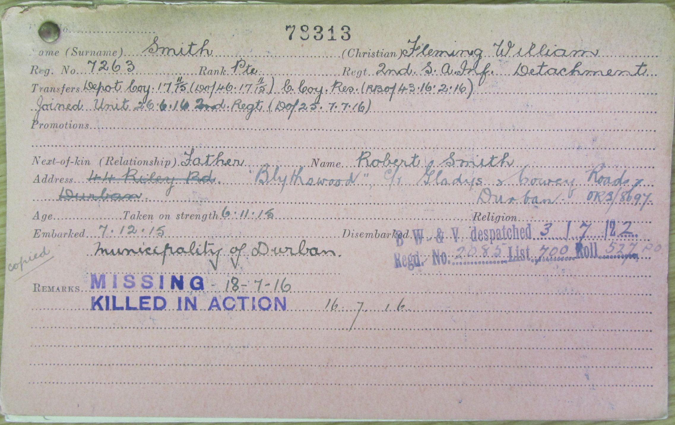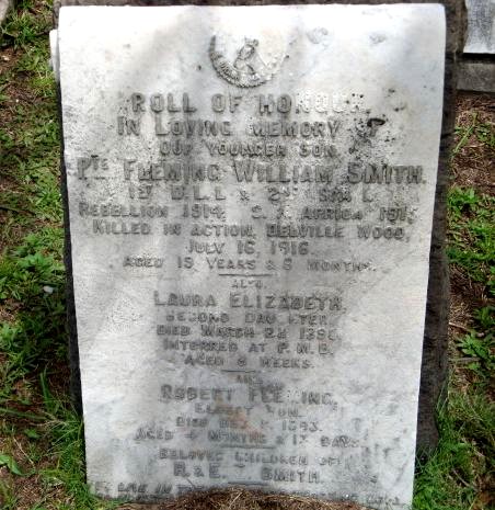 Son of Robert and Elizabeth Jane Smith, of 306, Cowey Rd., Durban, Natal. Born Durban. An electrical improver. Also served in German South West Africa. Commemoration stone in Durban (West Street) Cemetery
