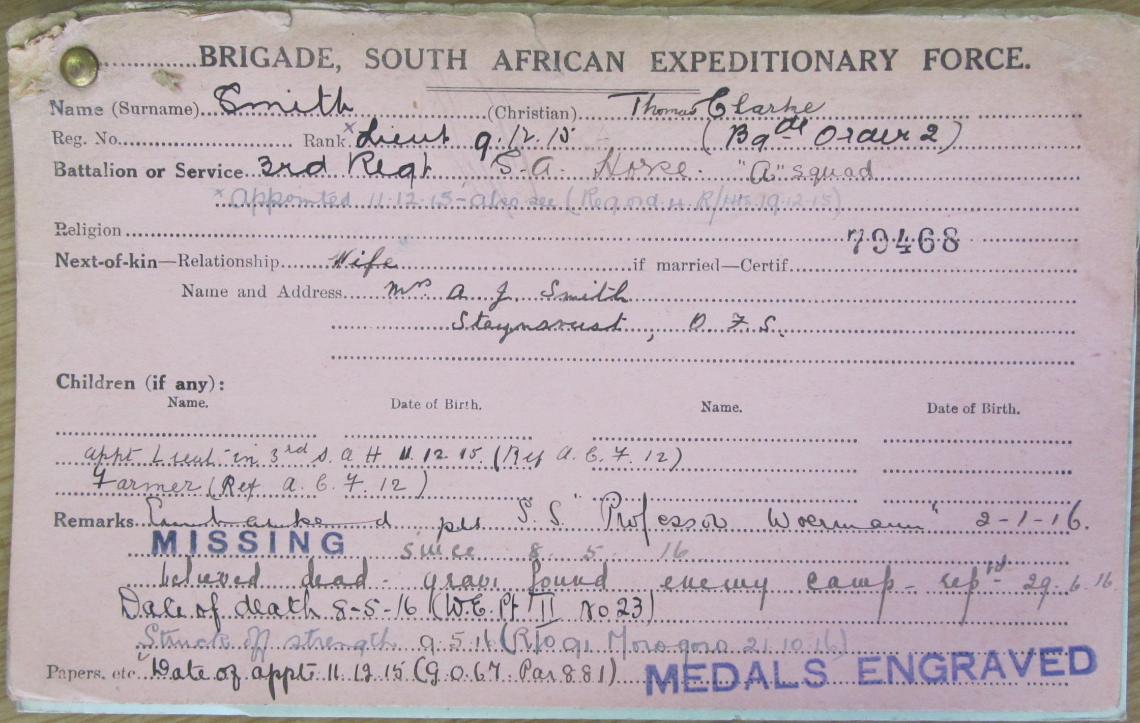 Son of William and Mary Ann Smith (nee Clarke); husband of Agatha Johanna du Randt (formerly Smith), of Ripley, Steynsrust, Orange Free State, South Africa. |