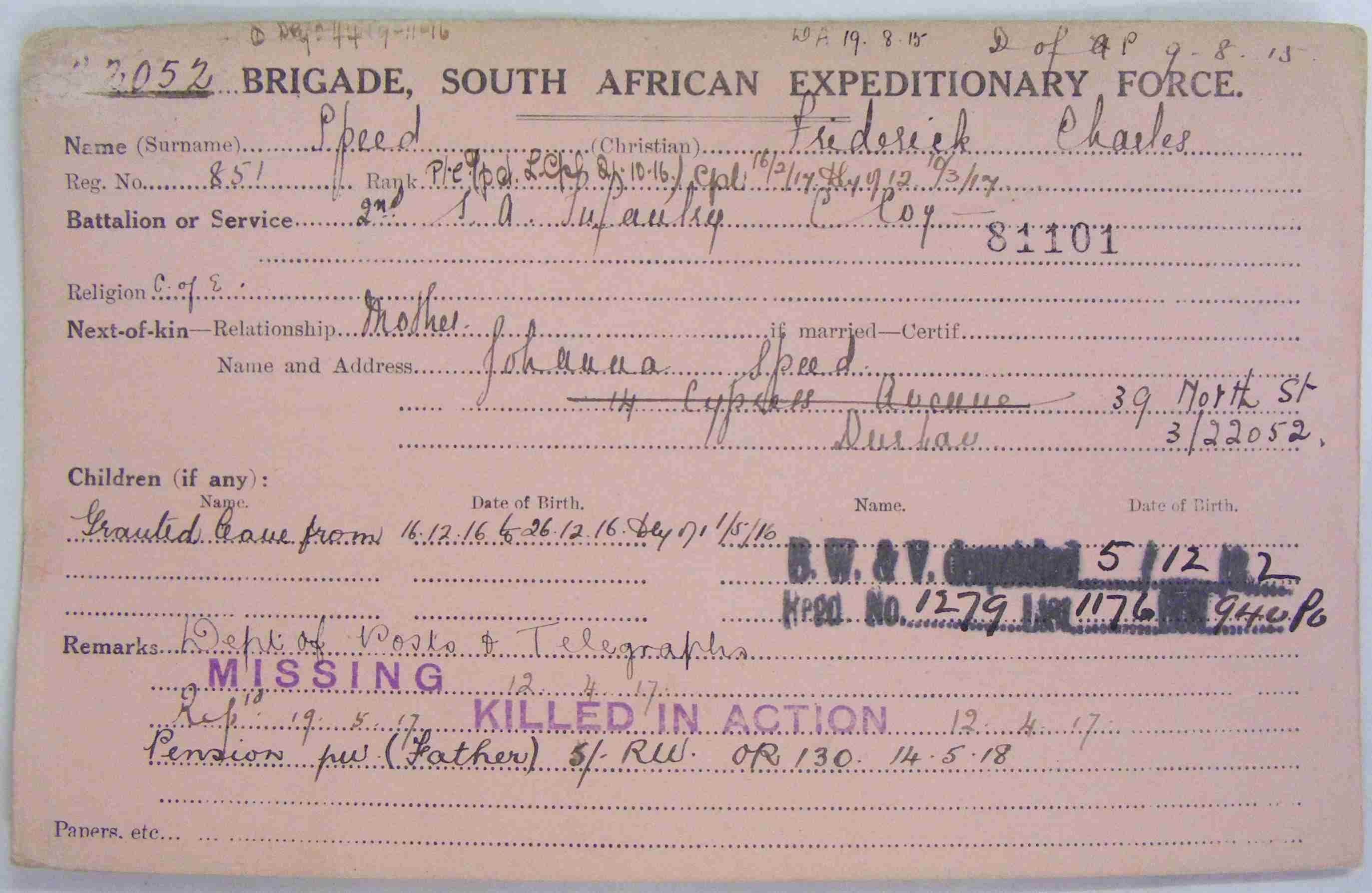 Son of Mr. H. and Mrs. Johanna Speed, of 13, Mitchell Rd., Durban, Natal. |