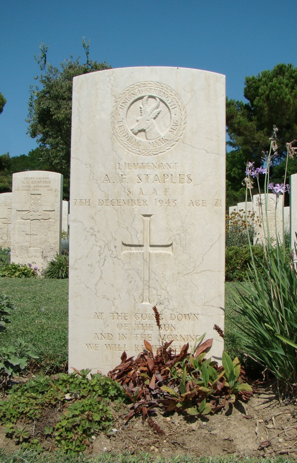 Son of Orville Franklin and Grace (nee Mountfort) Staples, of Langholm, Cape Province, South Africa. Born Grahamstown. Commemoration stone in Rokeby Park Seventh Day Adventist cemetery, Bathurst district, Eastern Cape. On Grahamstown Cathedral Parish Church memorial.