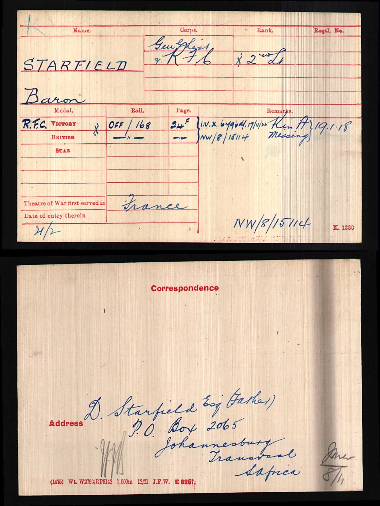 Son of Mr. D. Starfield, of 146, Market St., Johannesburg, South Africa. ***Jewish