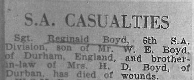 Son of Mr. W. E. Boyd, of Ford Terrace, Pallien Road, Sunderland, Durham, England. Brother of Capt. C. G. and his wife Mrs. H. D. Boyd, of Mill Road, Melville Park, Port Elizabeth. Born Pretoria. A plumber
