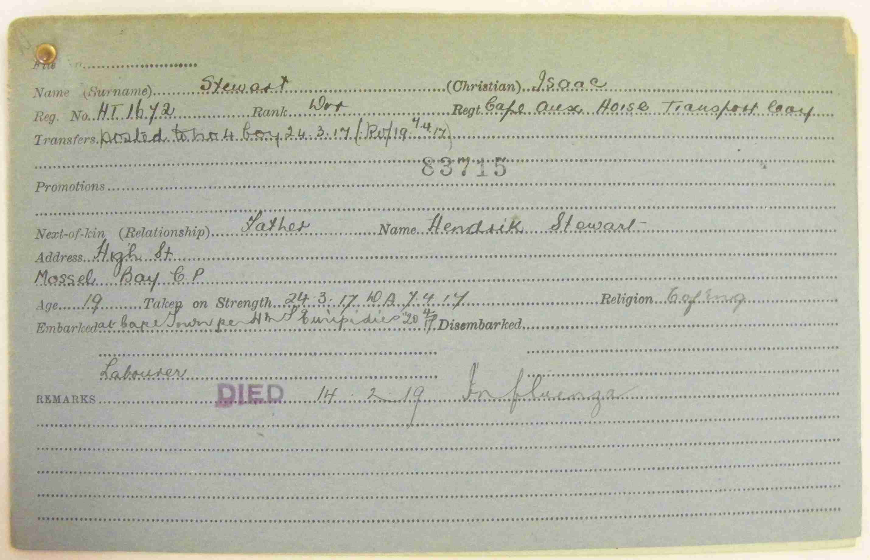 Son of Hendrick and Magdalena Stewart, of Mossel Bay, South Africa.