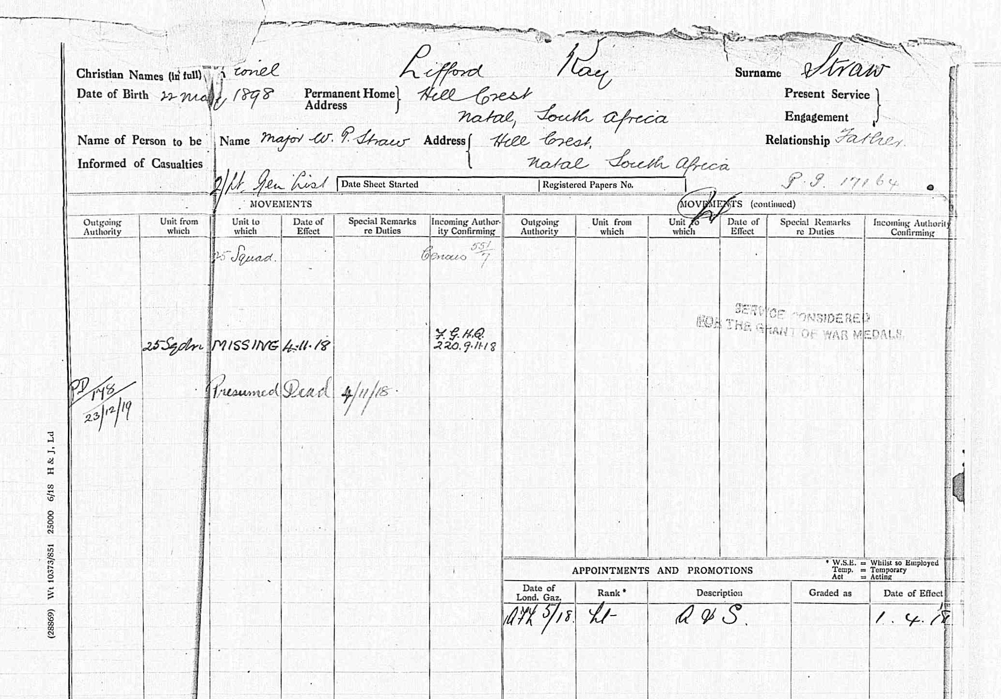 Son of Major William Pennington Straw, of Hill Crest, Natal. Also served in German East Africa with South African Horse. Attended Glenwood Technical High School, Durban. Born Kokstad. |