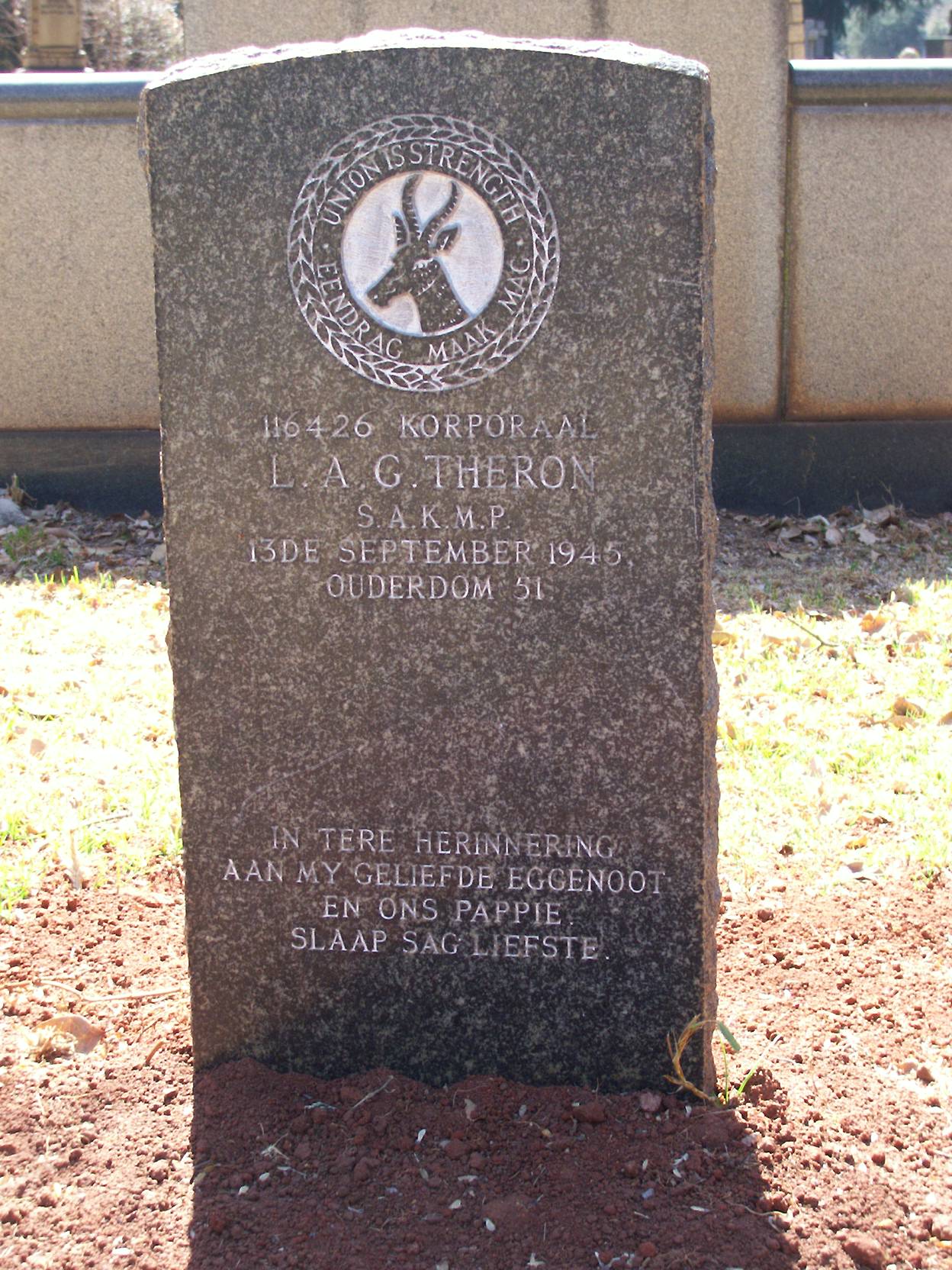 Son of Johannes N. and Amelia E. Theron; husband of Isabella E. Theron, of Johannesburg. Born Transvaal. A lorry driver