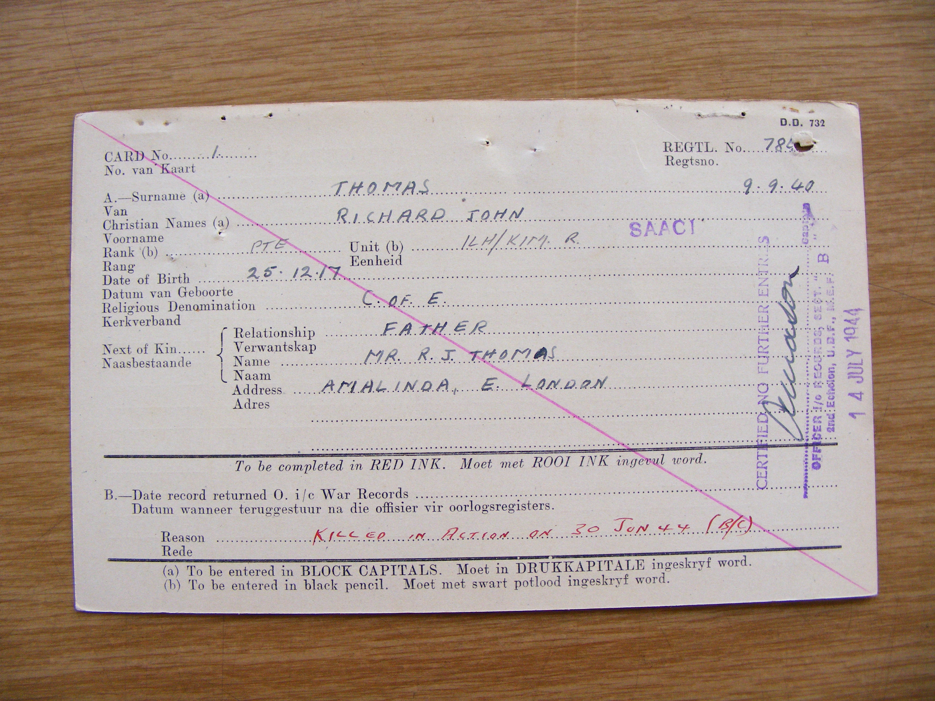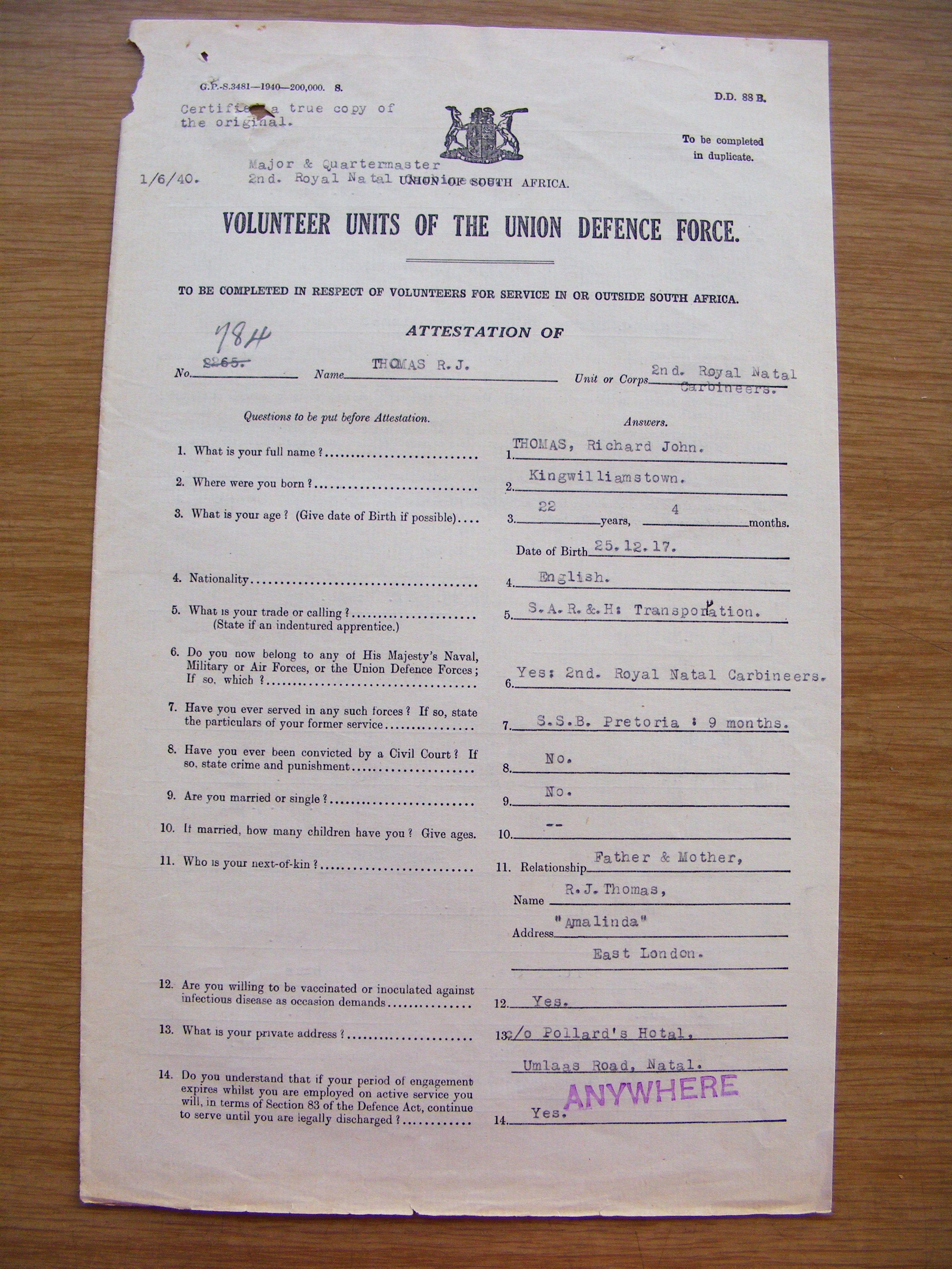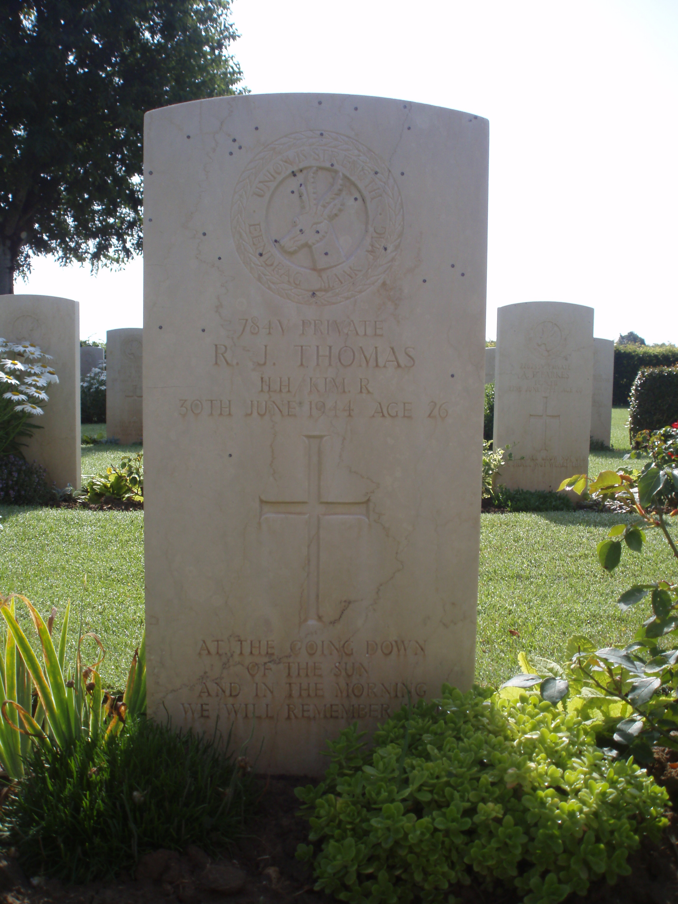 Son of Richard John and Jessie Alice Thomas, of Main Road, Amalinda, East London, Cape Province. Born in King William's Town. A station Foreman, Mount Vernon for SAR&H. He was unmarried.