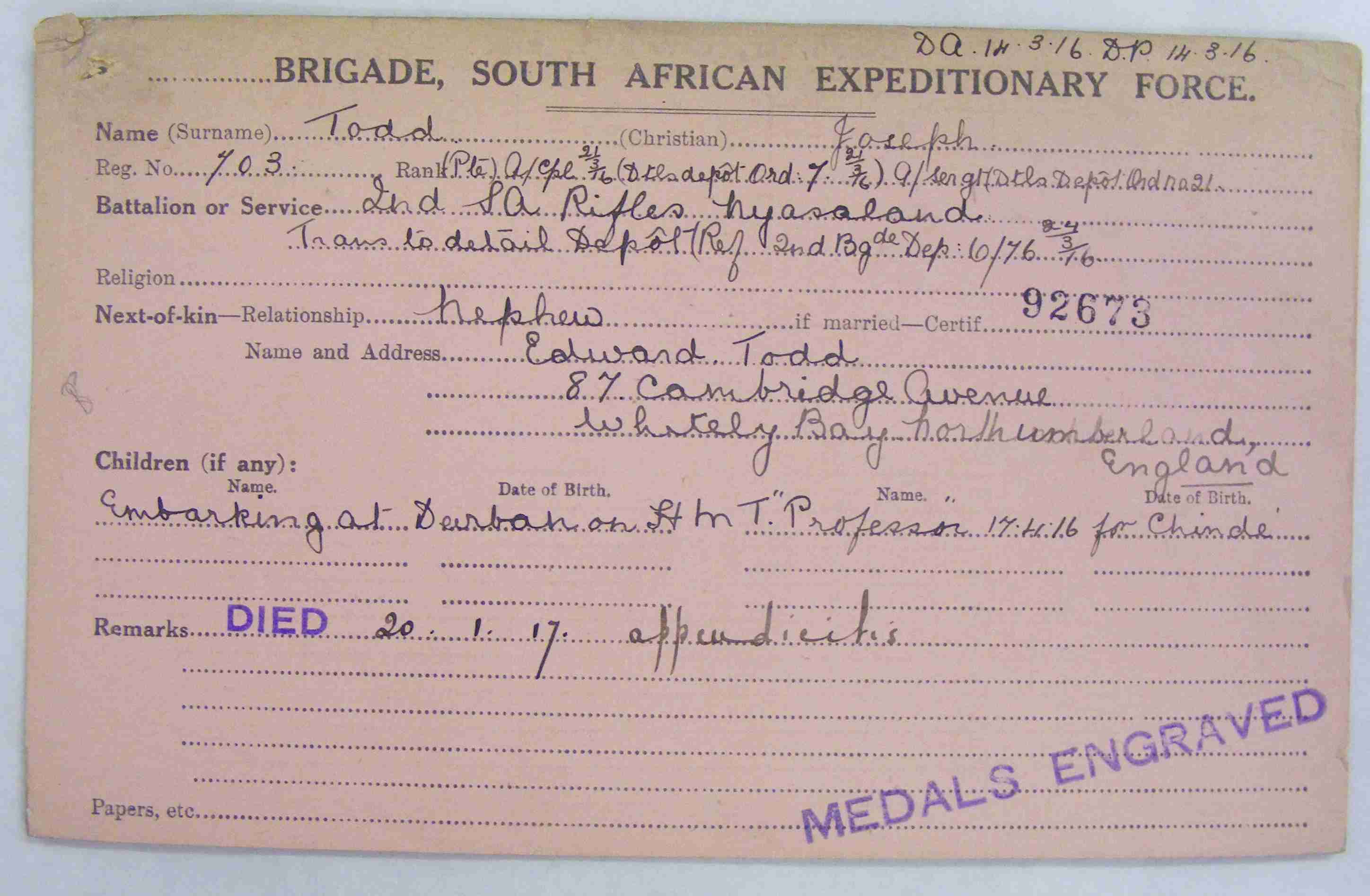 Uncle of Edward Todd, of 87 Cambridge Avenue, Whitely Bay, Northumberland, England
