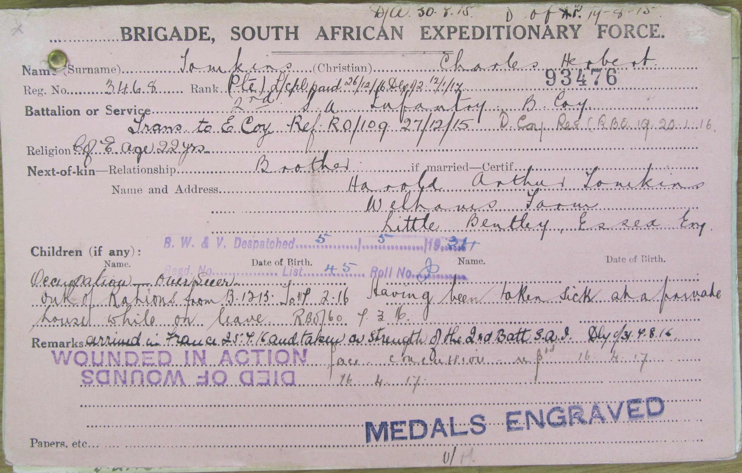 Son of Charles William and Florence Jane Tomkins, of Durban, South Africa. Born Botha's Hill. An overseer.