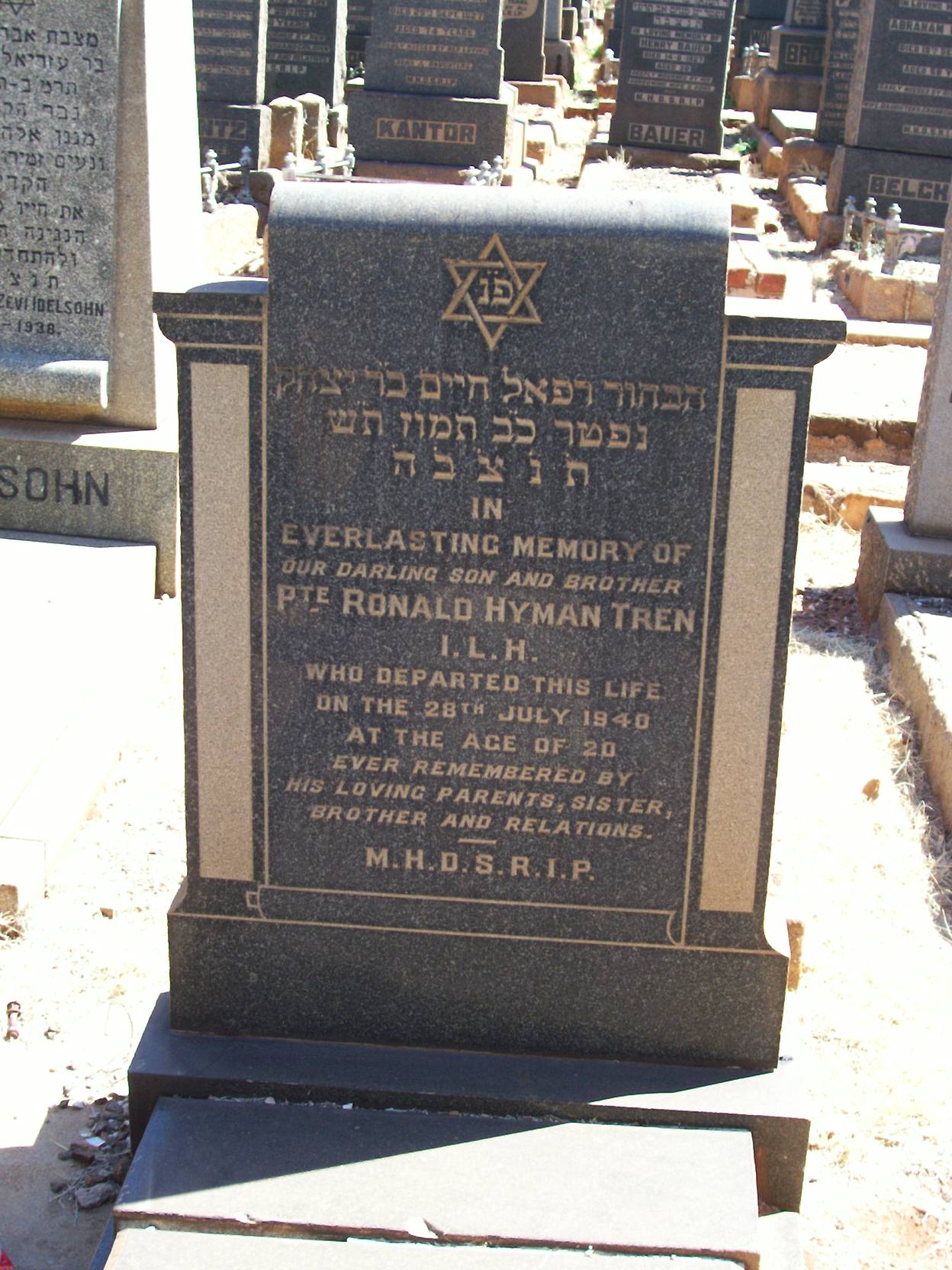 Son of Dr. Rudolph Montague Tren and Isabelle Tren (nee Kingsbury), of 4 Mentone Court, Killarney, Johannesburg. Born in Johannesburg. An Audit Clerk. He was unmarried. Educated at St. Andrew's College, Grahamstown. From Feb 1934 - Dec 1937. ***Jewish.