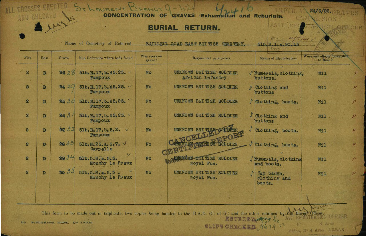Likely during 9th April 1917 operations. Found at Map Reference 51b.H.17.b.45.25. His means of identification were: Numerals, clothing and buttons