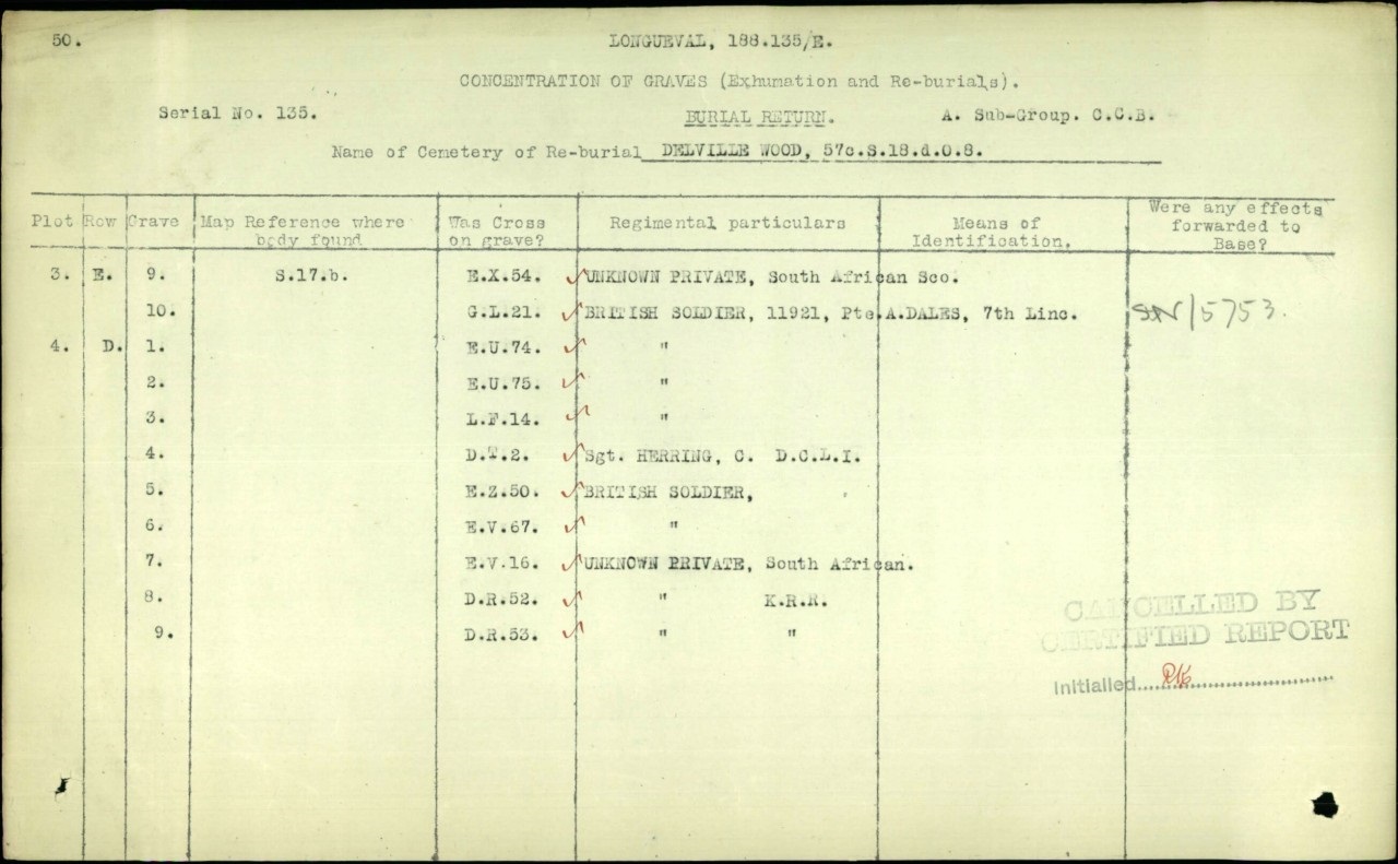 Found at Map Reference 57c.s.17.b or GPS 50.0262, 2.8042. This is the present day village of Longueval, West of Delville Wood. One can assume he died during the fighting of July 1916. His means of identification were: Cross on grave E.V.16