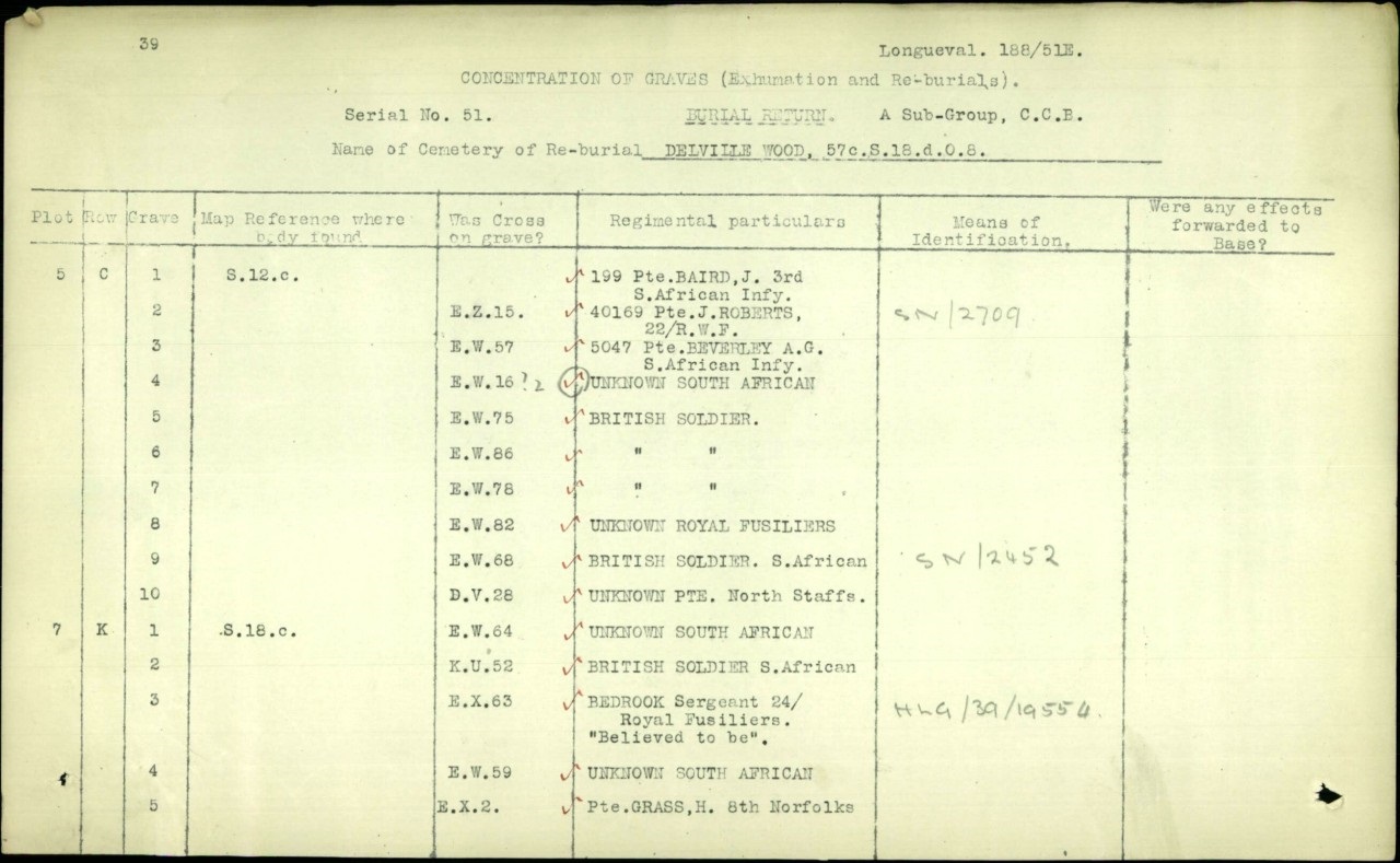 Found at Map Reference 57c.s.12.c or GPS 50.0343, 2.7975. This is Northern part of Delville Wood. One can assume he died during the fighting of July 1916. His means of identification were: Cross on grave E.W.16