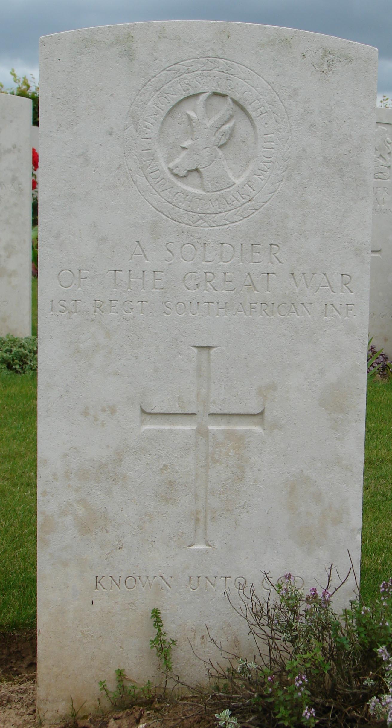 Found at Map Reference 57c.S.18.a.3.8. or GPS 50.0277, 2.8095. This is the center of Delville Wood. One can assume he died during the fighting of July 1916. His means of identification were: G. S. Uniform, boots, G. S. buttons and titles marked "1"