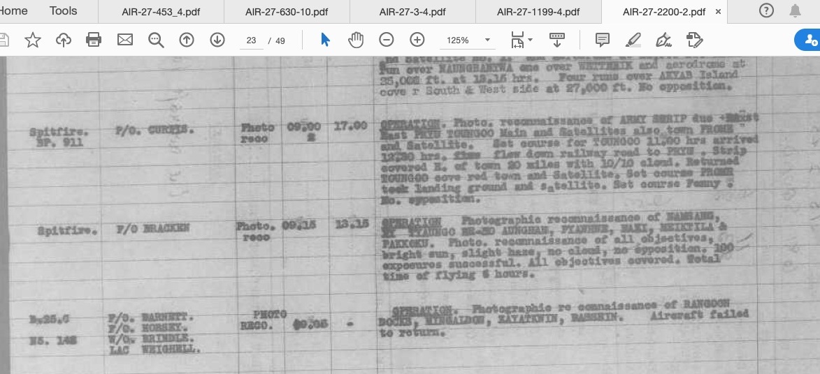 Killed in action, Mitchell N5-143, photo recce of Rangoon Docks, Mingaldon, Kayatawin, Rasshin, aircraft failed to return |
