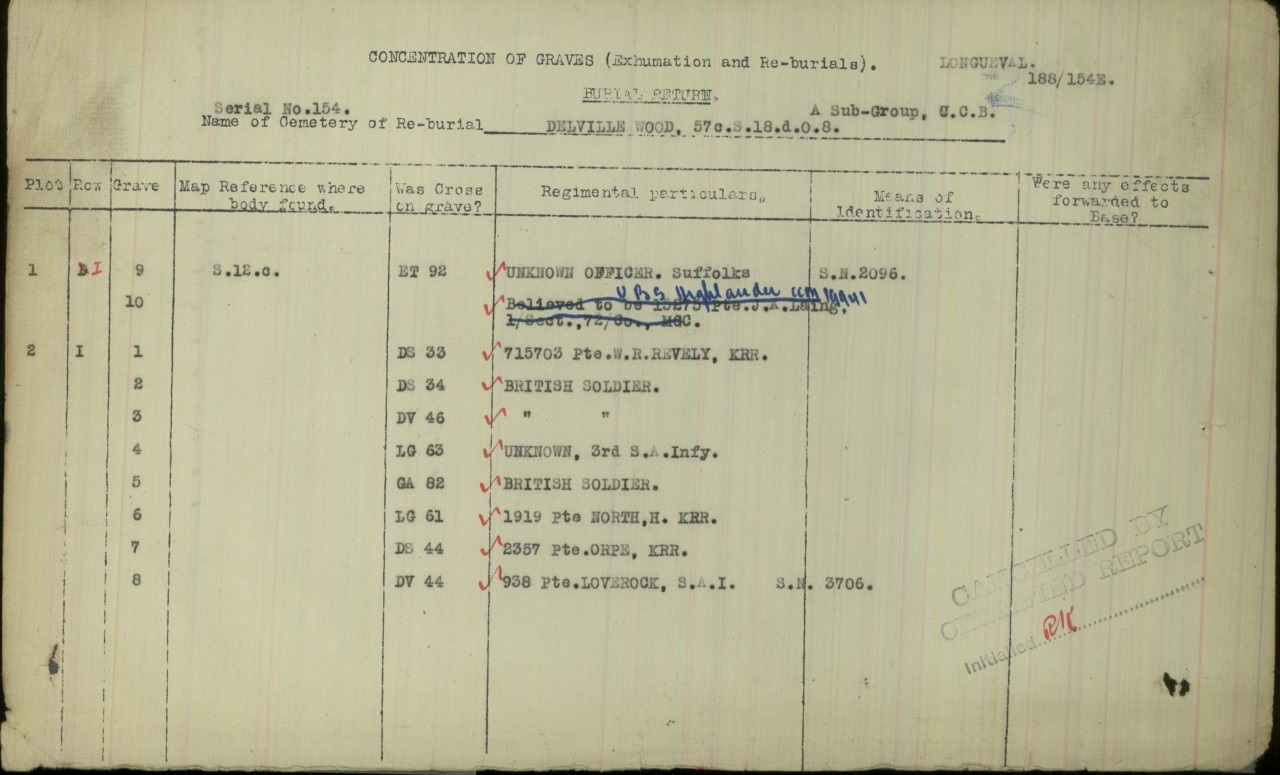 Found at Map Reference 57c.s.12.c or GPS 50.0343, 2.7975. This is Northern part of Delville Wood. One can assume he died during the fighting of July 1916. His means of identification were: Cross on grave L.G.63
