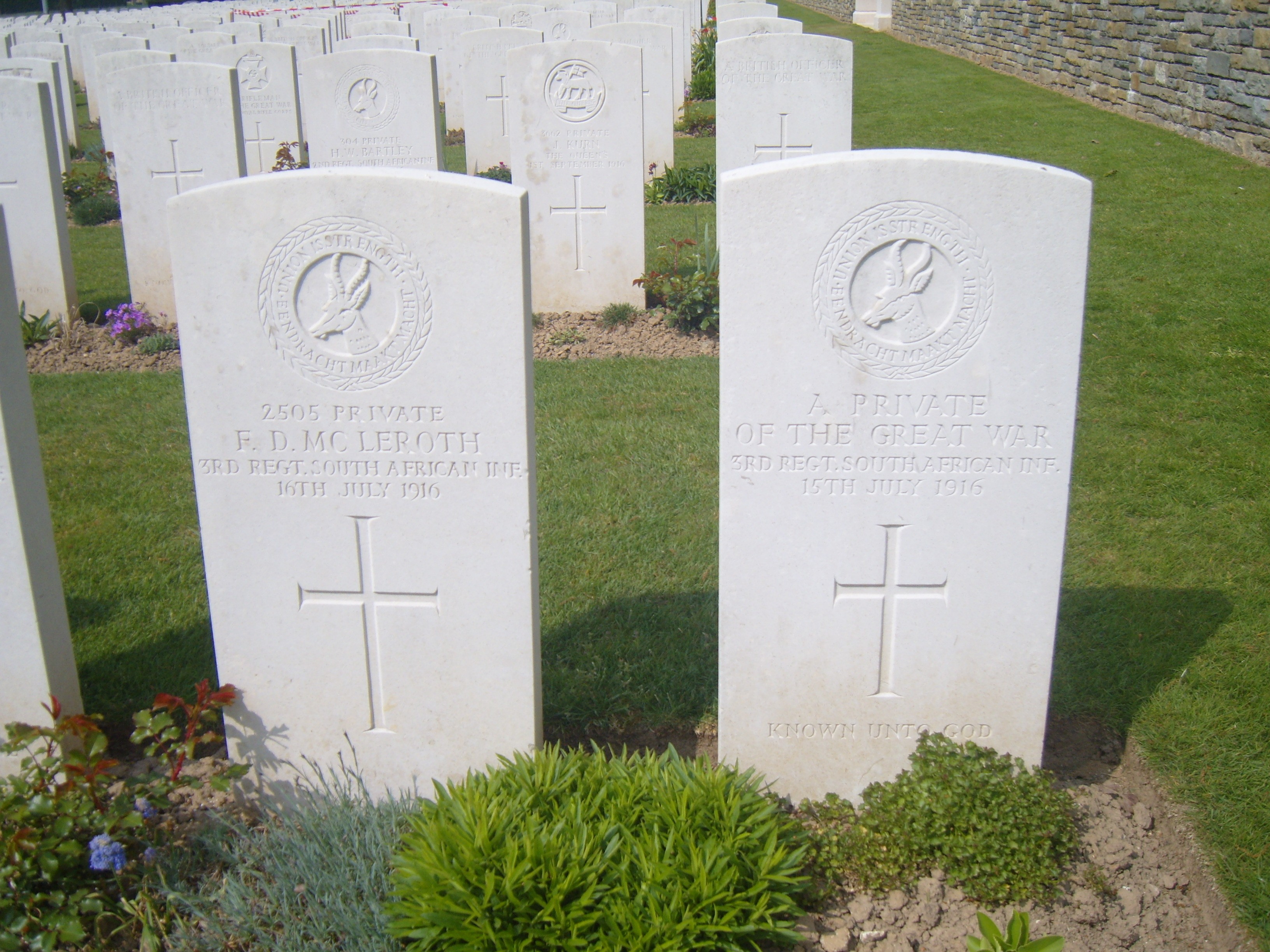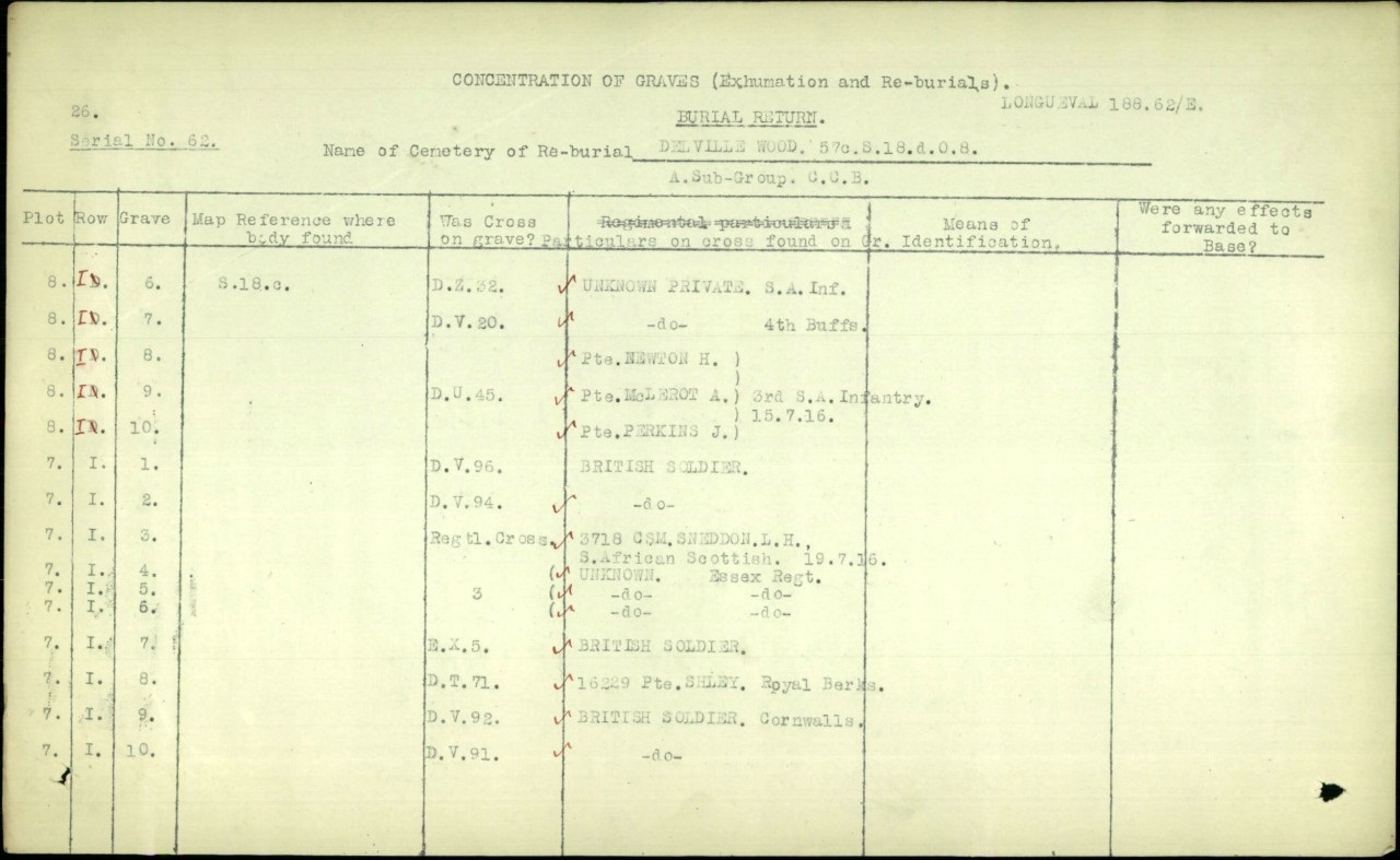 Found at Map Reference 57c.s.18.c or GPS 50.0222, 2.8107. This is South of Delville Wood. One can assume he died during the fighting of July 1916. He was buried with McLeroth and Newton in same grave. Originally identified as Pte. J. Perkins, but later marked as unknown as another Pte. J. Perkins found in another grave.