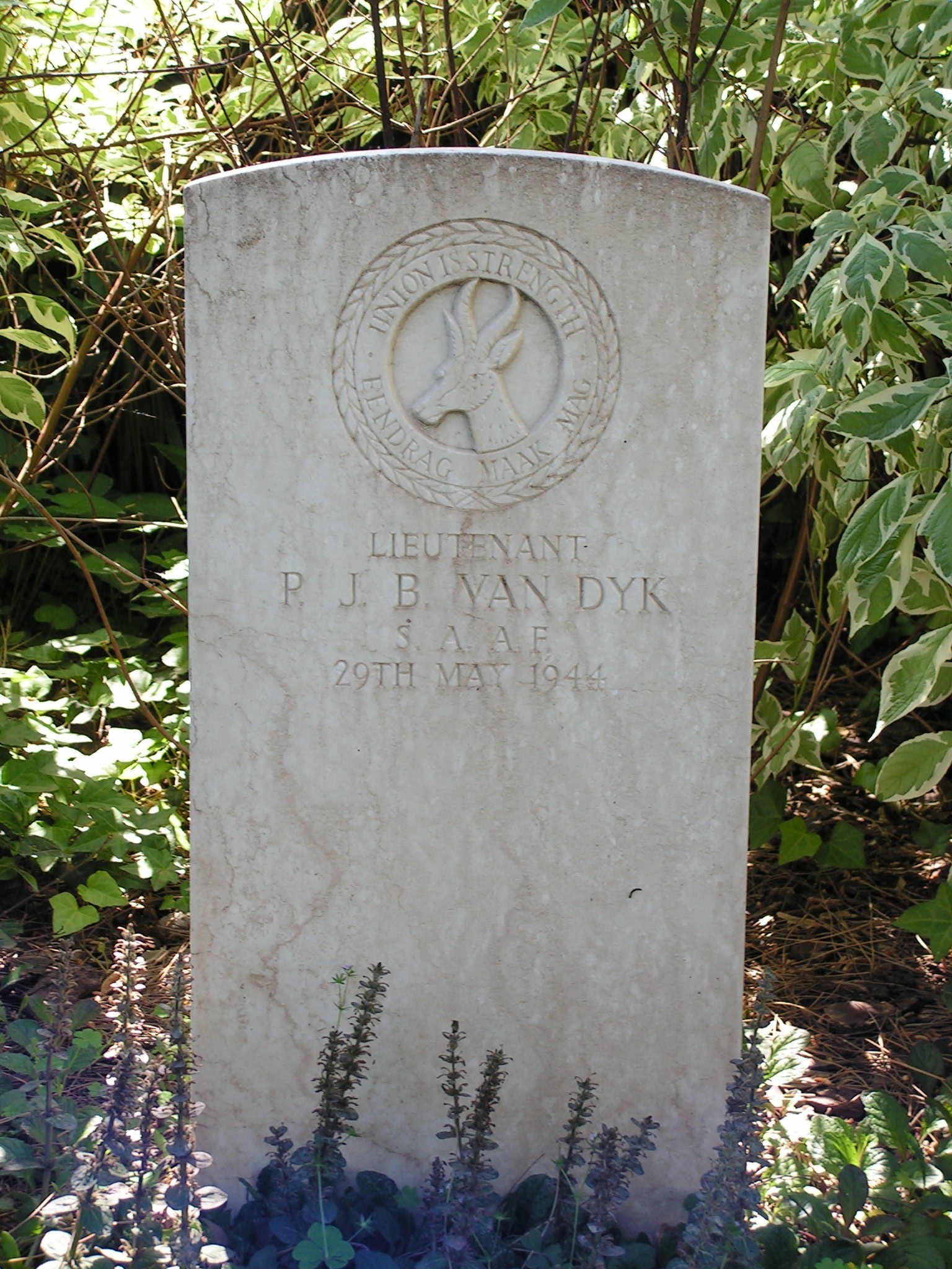 Killed in action, Martin Baltimore Mk III FA460, took off from Biferno Landing Ground, Italy, at 05h33 on a daylight raid together with ten other aircraft in formation to attack enemy Light Anti-Aircraft positions. The box in which Major De Villiers DFC and his crew were flying, could not locate their target owing to mist and cloud so they carried on with the mission, searching for transport on roads. They eventually bombed the Railway Yards and Station at Velletri. Immediately after bombing the target, the aircraft flown by Major de Villiers was seen to be on fire, losing height before breaking up in the air. No parachutes were seen to open. Moderate heavy-calibre but largely inaccurate anti-aircraft fire was encountered over the target area before, during and after bombing. |