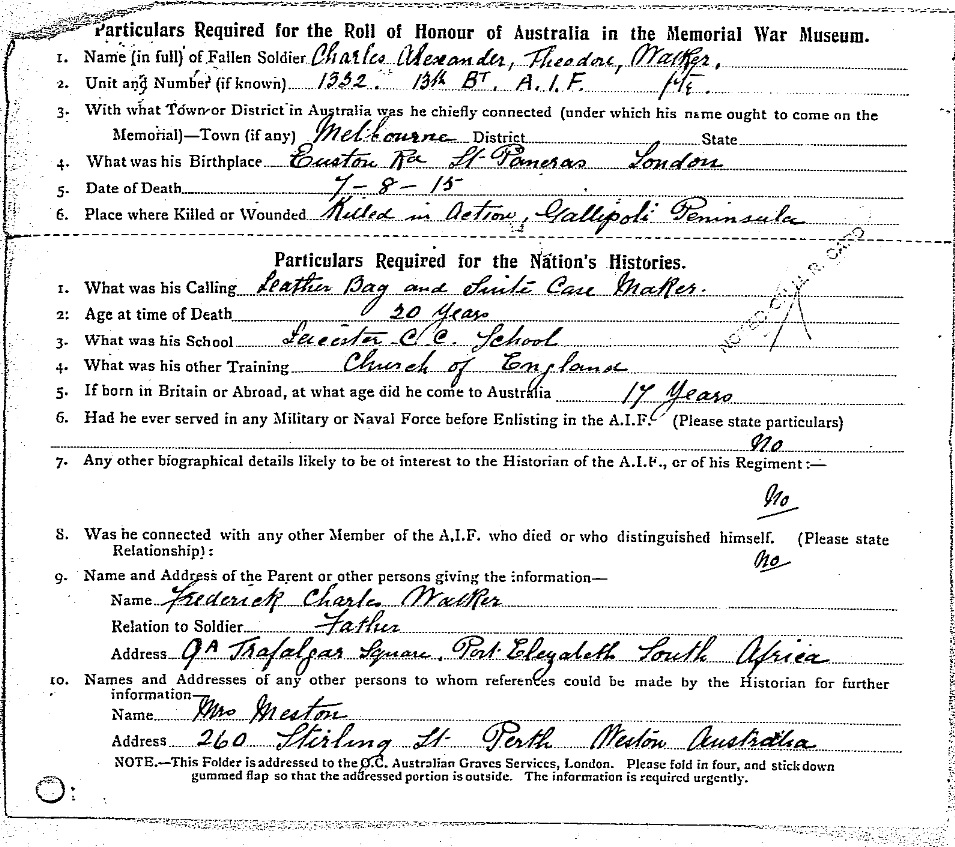 Son of Frederick Charles and Grace Caroline Walker, of 9A, Trafalgar Square, Port Elizabeth, South Africa. Native of London, England.