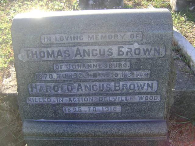 Son of Edith Blanche Brown, of 37, Gautner St., Forest Hill, Johannesburg, and the late Thomas Angus Brown. Commemoration stone in Durban (Stellawood) Cemetery