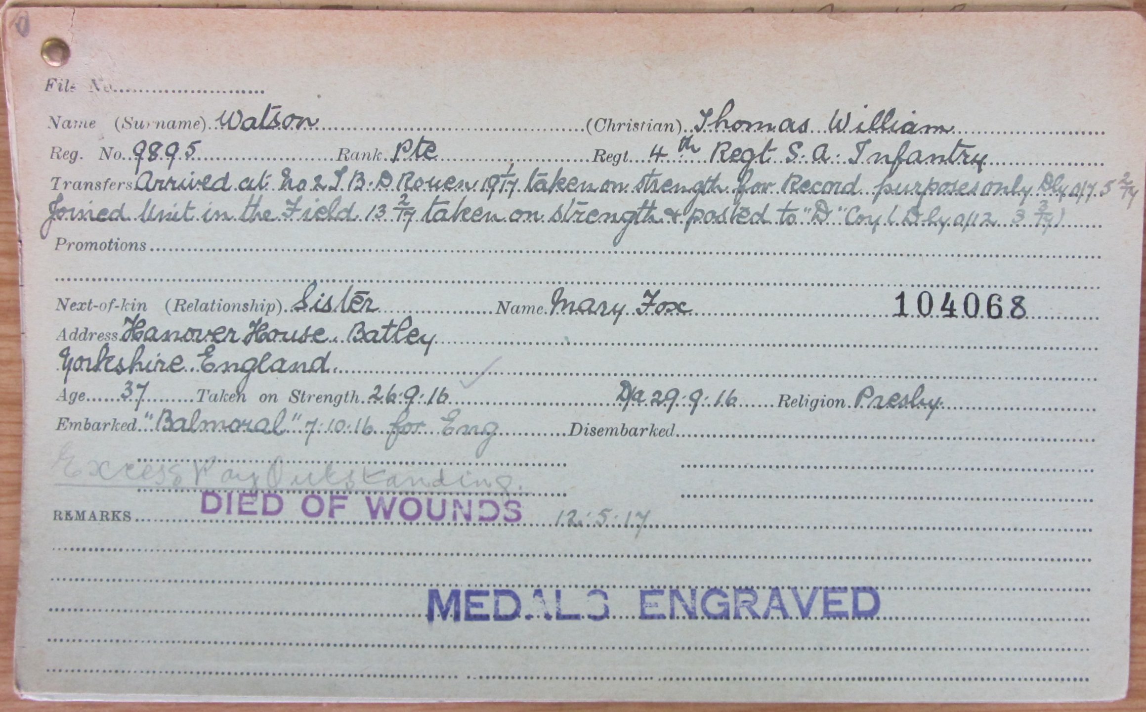 Brother of Mary Fox, of Hanover House, Batley, Yorkshire, England