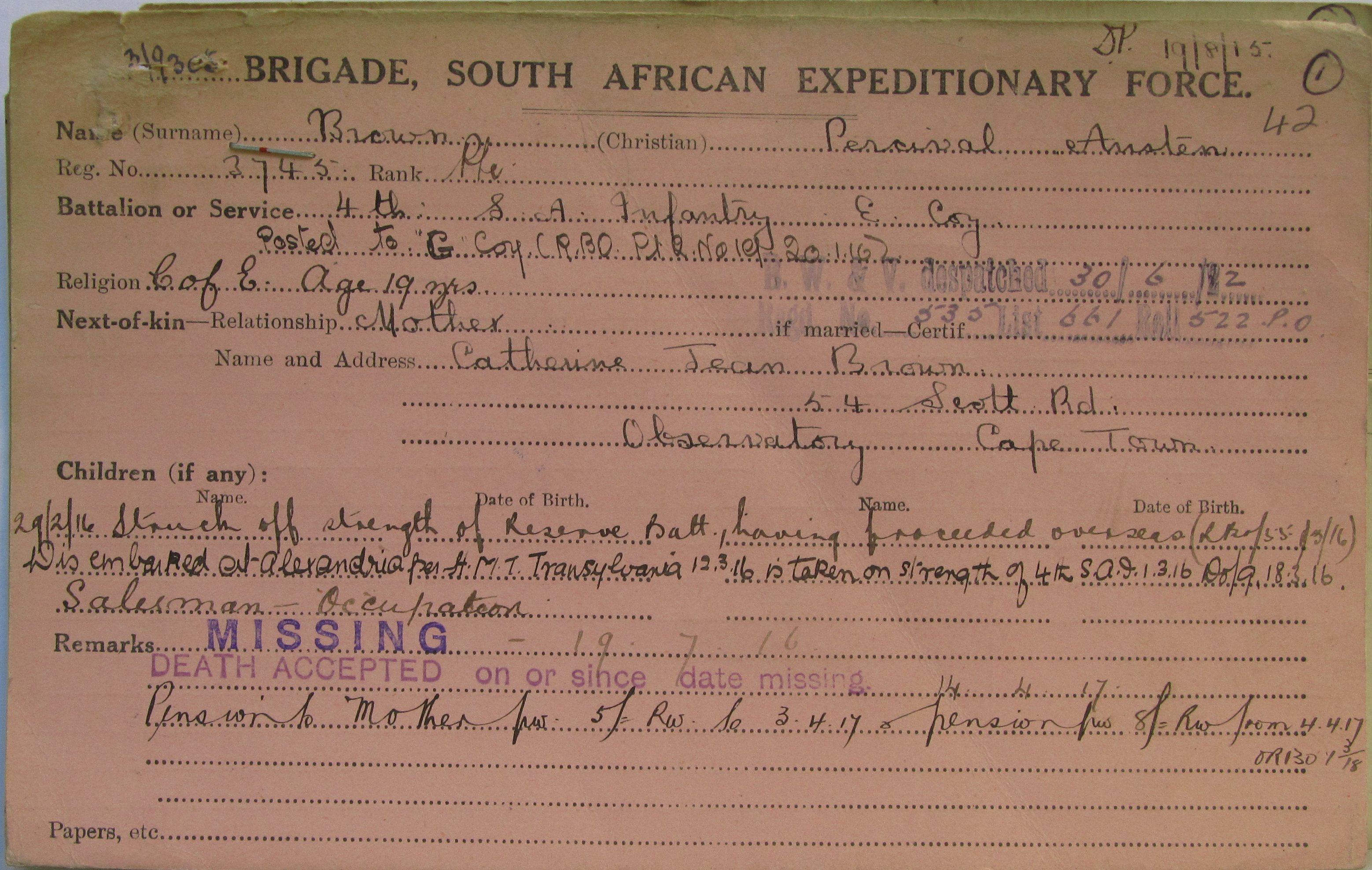 Son of Mrs. Catharine Jean Brown, of "Stoneleigh", Queens Rd., Sea Point, Cape Province, and the late Thomas Brown.