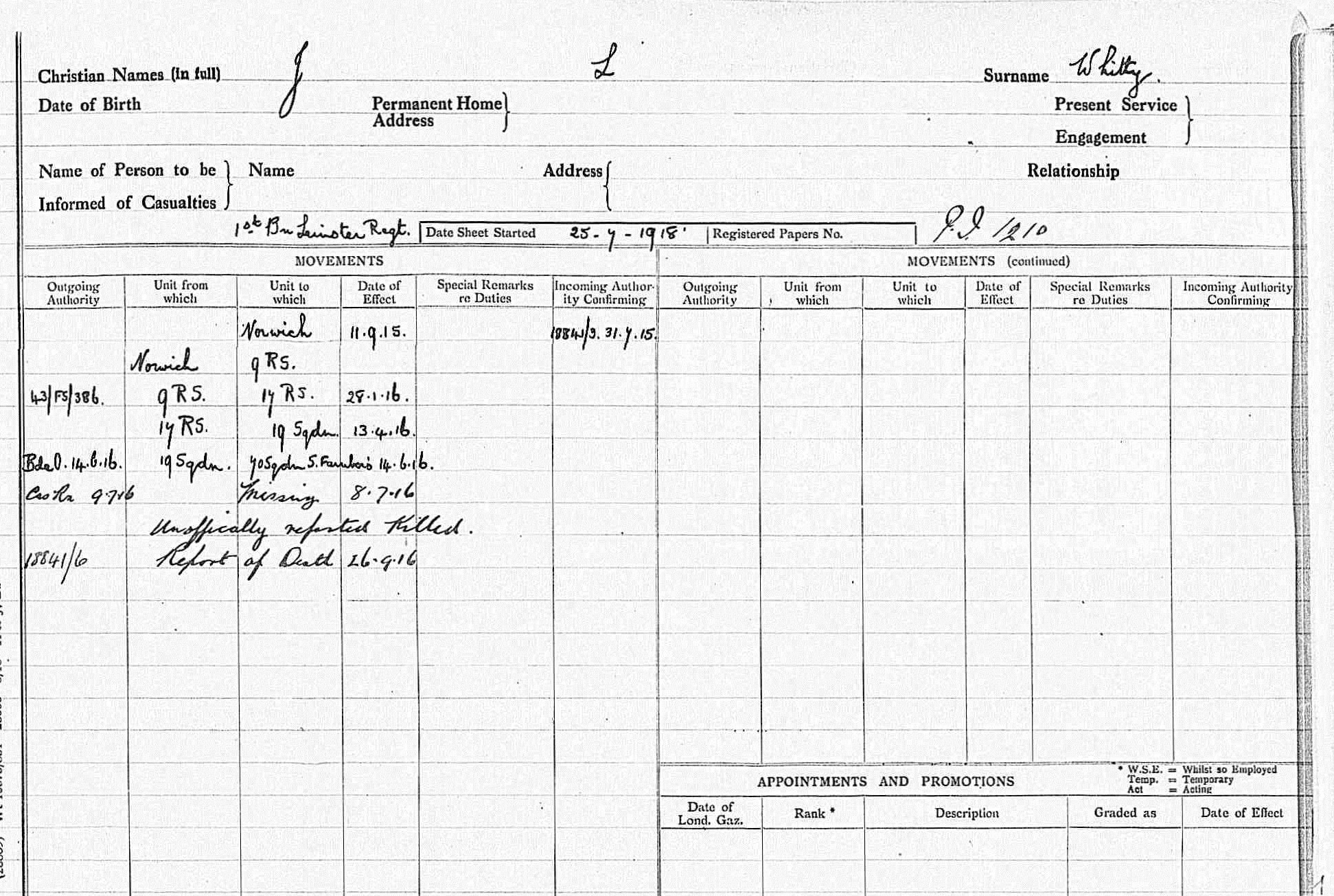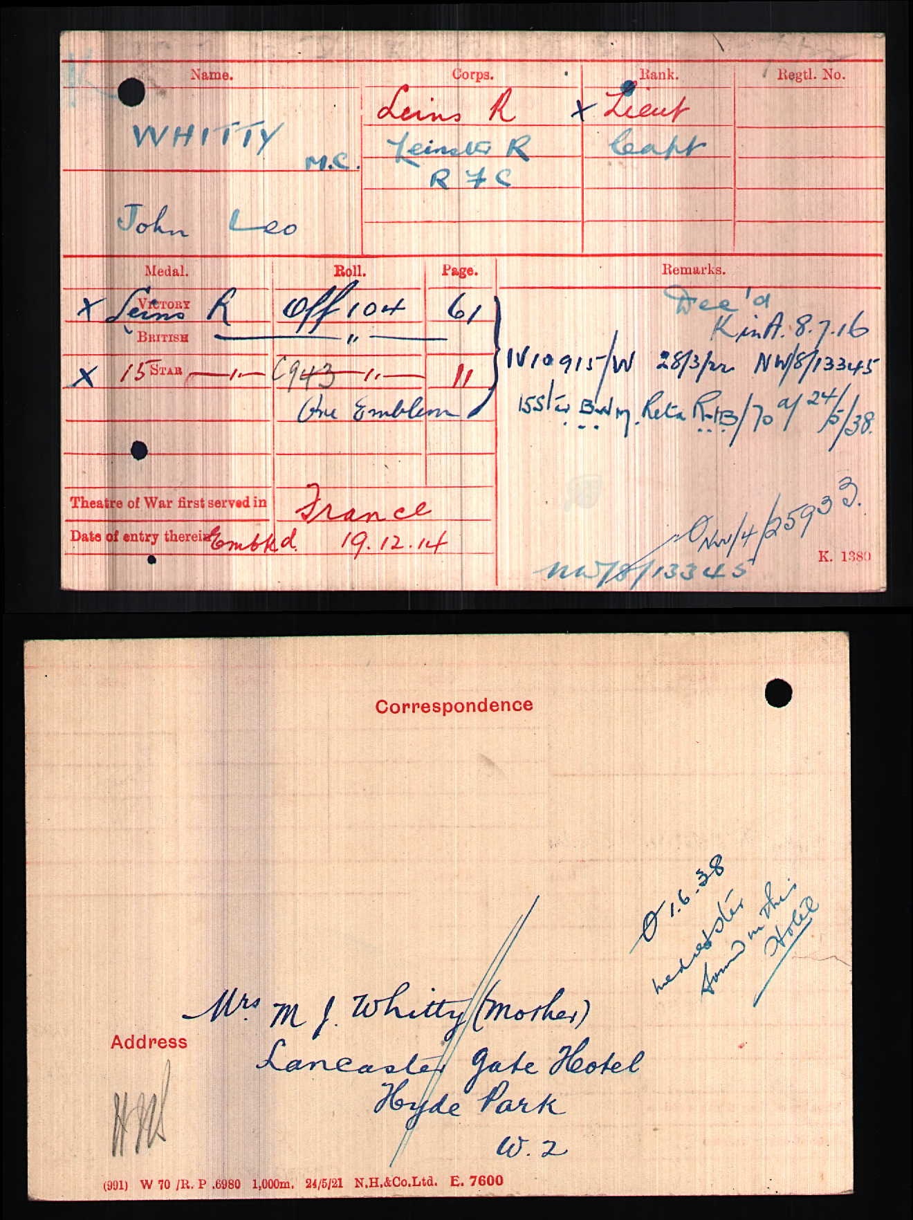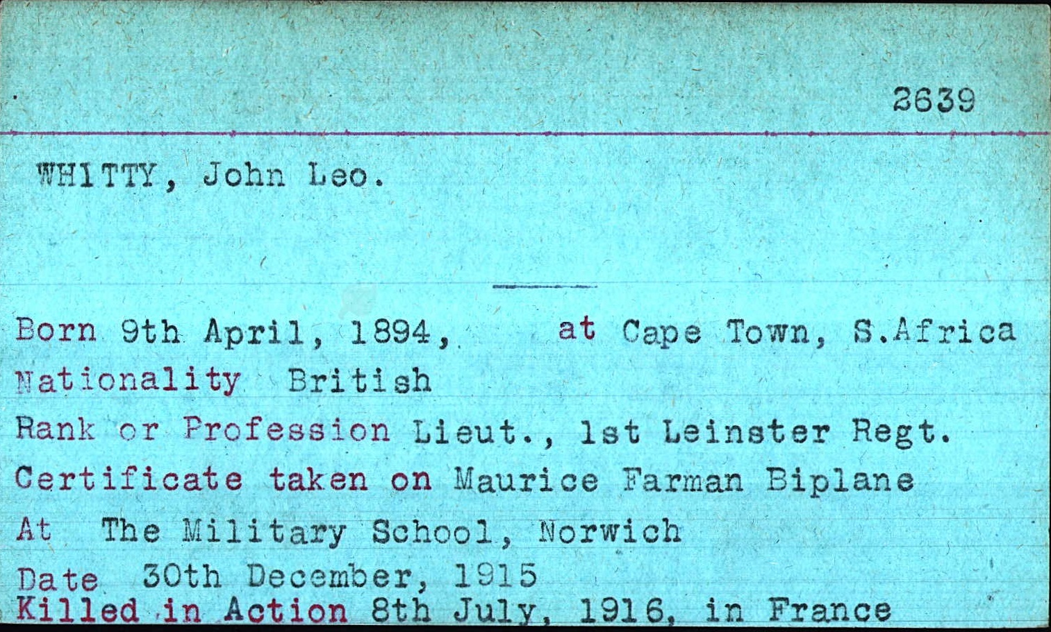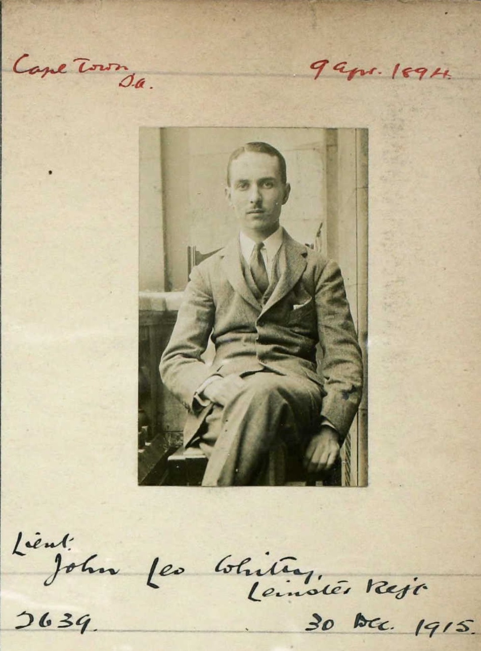 Son of Lieut.-Col. M. J. Whitty, R.A.M.C, and with his two brothers, Richard and Paddy, he spent several years in Castleknock. He was gazetted from Sandhurst to the Leinster Regiment in February, 1913. He joined the 1st Battalion at Fyzabad in the following September, and after the outbreak of war returned with it from India to France. He was wounded at the retaking of the village of St. Eloi on March 15, 1915, in which action the 1st Leinster Regiment especially distinguished itself. Native of Cape Town, South Africa. Commemorated Castleknock College Union War Memorial. Commemorated St. Francis Xavier's R.C. School, Everton. ref. South African Roll of Honour 1914-1918 |