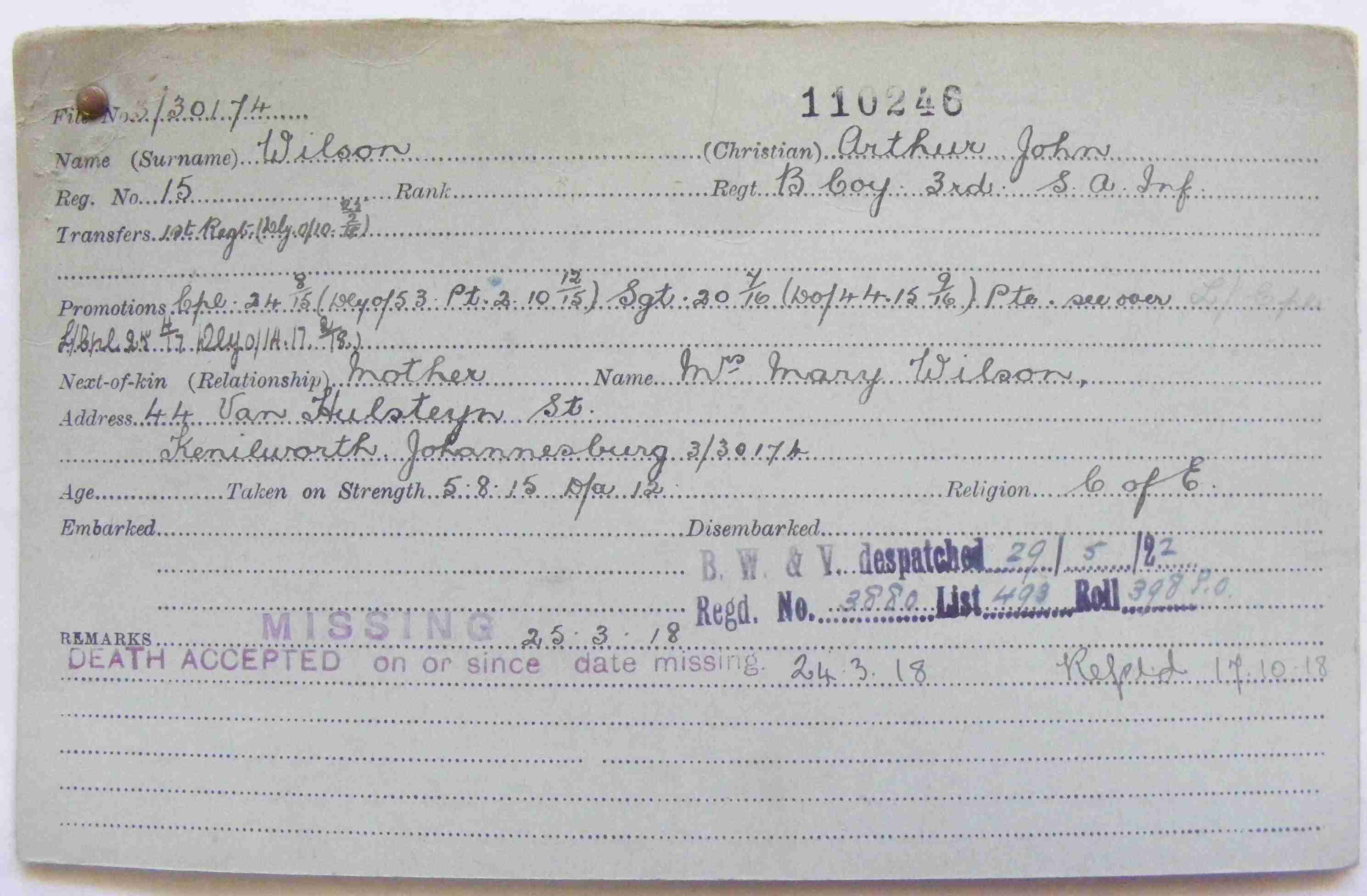 Son of Frederick Thomas and Mary Wilson, of Kenilworth, Johannesburg. Born Pietermaritzburg. A miner. |