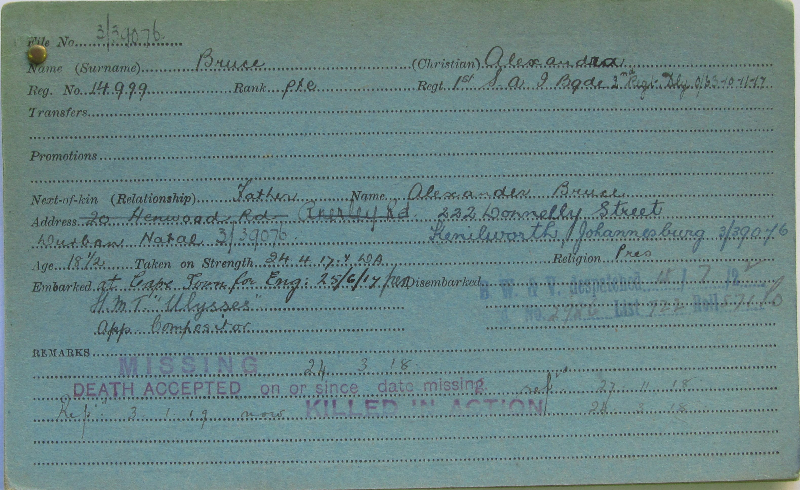 Son of Alexander and Catherine A. Bruce, of Kenilworth, Johannesburg, Transvaal. |