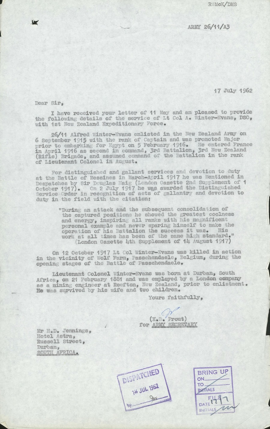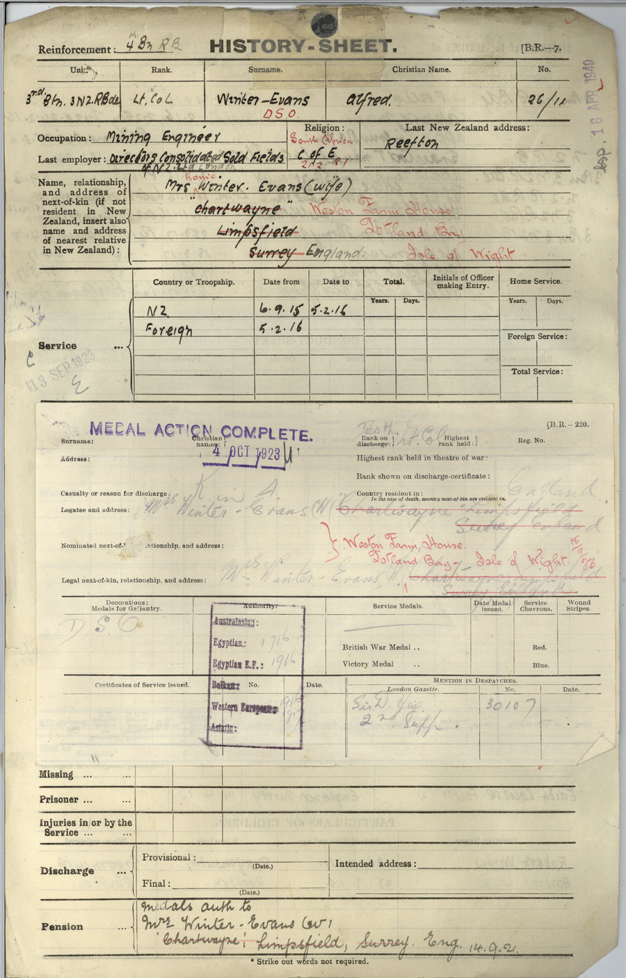 Son of the late Colonel Robert Winter Evans. Husband of Mrs. Edith Louise Winter-Evans, of Reefton, New Zealand. Born in Natal. He was recommended for the Victoria Cross while a teenager serving in the Boer War for his native South Africa. He was awarded the D.C.M. He spent five years at St George's school at Harpenden Heights. After the Boer war he went to New York where he attended Columbia School of Mines (he is listed on Columbia University's honours board). Prior to going to war Winter Evans was either general manager or assistant general manager of Consolidated Gold Fields of New Zealand Ltd - which operated a number of gold mines in the Reefton area of the West Coast of the South Island of New Zealand. During a turbulent period in the history of the Reefton gold mines in 1912 Evans led the company in a bitterly fought six month strike - at the end of which he introduced new work practices which improved productivity substantially and are credited with ensuring the mines continued to operate over the next two decades when inflation increased prices in NZ by some 67 percent. Left New Zealand with the Rifle Brigade. Prior to joining the Expeditionary Force, he held a commission in the New Zealand Motor Service Corps. He arrived at the front during the great war in May 1916 and was awarded the D.S.O in the field. He married Edith Louise Foster of Limpsfield Surrey and had two children. He was awarded the D.S.O. for gallantry at Messines. ref. South African Roll of Honour 1914-1918. |