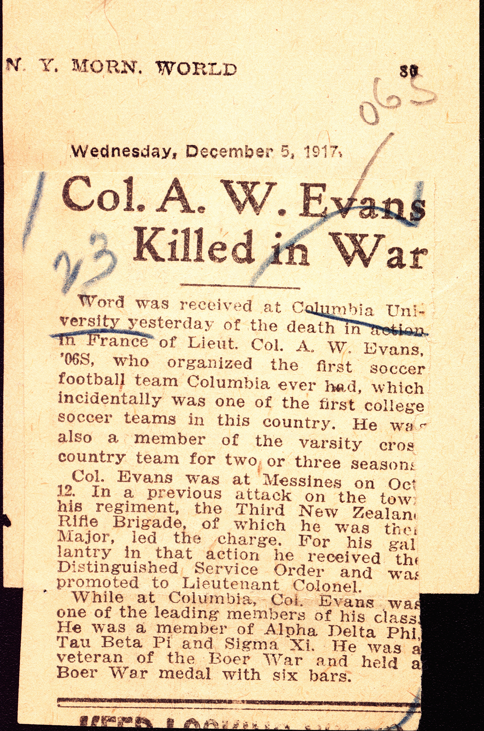 DSO LG Sup 14 August 1917 pg. 8353 - "For conspicuous gallantry and devotion to duty. During an attack and the subsequent consolidation of the captured position he showed the greatest coolness and energy, inspiring all ranks by his magnificent personal example and never sparing himself to make the operation of his battalion the success which it was. His work at all times has been of the same high standard." DCM LG 20 July 1900 - "On 23 October, five men were sent along the road to Newcastle with the aim of ascertaining the position and strength of the Boers in that area. Contact was made, the Boers opened fire on the patrol, and the men hastily retreated. In doing so one man's horse bolted and he was left stranded. On seeing the man's predicament, Trooper A W Evans caught the runaway horse and returned it to its fallen rider, thereby saving him from certain capture or death. In spite of retreating under heavy fire, all five men returned safely to Ladysmith", MID LG 1 June 1917 pg. 5429 - "For skill and ability while commanding his Battalion. On 1st October 1916 his Battalion was supporting the Division on the right, when he established a line of strong points and held them, until ordered to withdraw. Colonel Winter-Evans, then 2nd-in-command, commanded his Battalion throughout the operations on the Somme, and always displayed coolness and energy in the performance of his duties." MID LG 28 December 1917 pg. 13575 - "Mentioned in Field Marshall D. Haig's despatch of 7 November 1917 for distinguished and gallant services and devotion to duty during the period February 26th to midnight September 20-21st, 1917" |