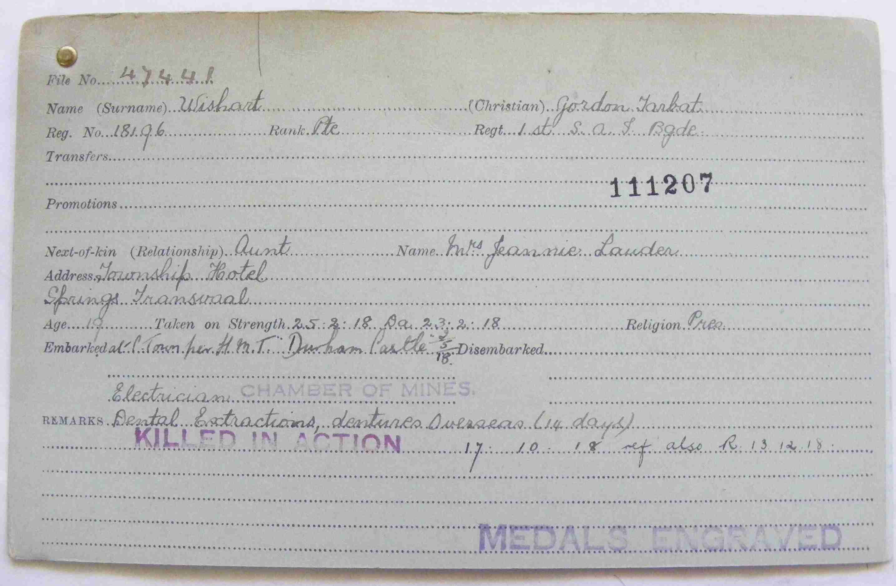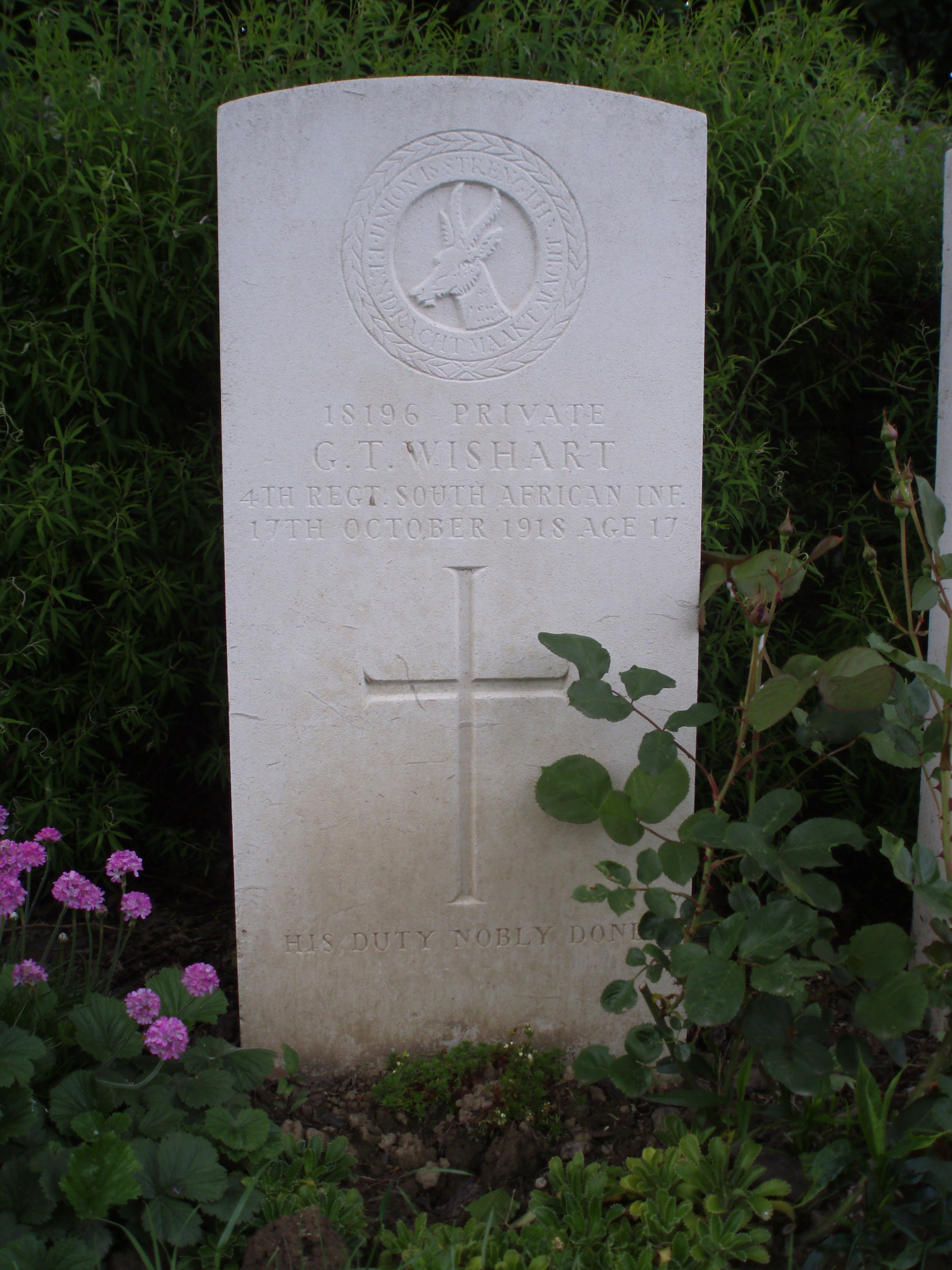 Son of James Wishart and Isabella Buchan Walker. Born Port Elizabeth. An apprentice electrician in the township of Springs, Transvaal. Enlisted in Boksburg on 23 February 1918. Embarked in Cape Town on the transport ship Durham Castle for Europe on 2 May 1918 and arrived at Tilbury docks on 5 June. He was sent for training in Woking and taken on strength of 'H' Company, 2nd (Reserve) Battalion, South African Infantry. On 25 August, he sailed for France from Southampton. After four days at the Infantry Base Depot in Rouen, Gordon was sent to join to 'A' Company of the 4th Regiment, South African Infantry. Within two weeks of arriving at the front, Gordon was sent to the South African Field Ambulance, suffering from rubella. He spent the next month recovering at the New Zealand Stationary Hospital in Wisques. He was discharged back to duty on 7 October and returned to the regiment in time to take part in the recapture of Le Cateau. In the attack, which took place on 17 October, the South Africans were tasked with crossing the River Selle north of the town, seizing the railway and linking up with the 50th Division north of the railway triangle before establishing themselves on a spur east of Le Cateau. At 8 pm on 16 October, Gordon?s unit began to move towards the river, the crossing of which was said to be slow work because of the slender footbridges and narrow gaps in the wire. Upon reaching the east bank, the South Africans found themselves in places not fifty yards from the Germans holding the railway embankment. By 4:30 am the following day, the assembly for the attack was complete. A heavy mist rose from the valley, which shielded the South African?s position from the enemy and allowed them to advance at close range when zero-hour arrived at 8:05 am. With visibility at about fifty yards, the first wave of the attack quickly disappeared into the fog. The regiment stalled a hundred yards beyond the South African line when they came upon a sunken road protected by a palisade. Many men from the 4th were killed by machine-gun fire at this position, while those who eventually made it through encountered another more formidable obstacle near the railway. A belt of wire entanglements about sixty yards deep stood between them and their next objective; however, luck was on their side, and a way through was discovered in the form of a shallow trench used by the Germans to access an outpost. Slowly, they worked their way through the railway, where furious close combat fighting occurred. It is likely that Gordon had been killed at some point during the initial stages of the attack; however, if not, he would have almost certainly lost his life in the advance towards the next objective, which was hampered by enemy field guns that had accurately registered the regiment's position. |