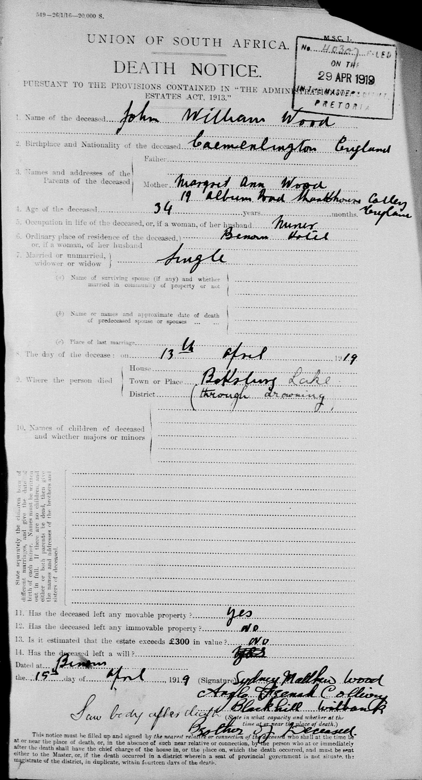 Son of Margaret Ann Hutton, of Albion Row, Shank House Colliery, Northumberland, England. An underground miner. |