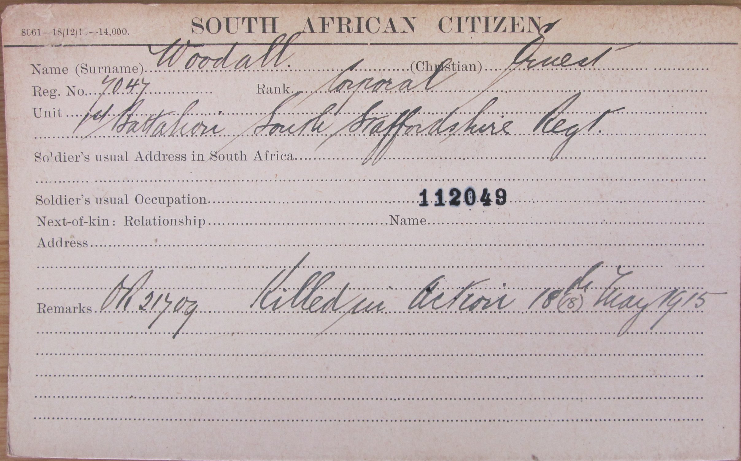 Son of Daniel Woodall. Husband of Petronella Catherine Sophia Woodall, of Witbank. Born Mill Lane, Tutbury. A shunter with South African Railways. ref. South African Roll of Honour 1914-1918