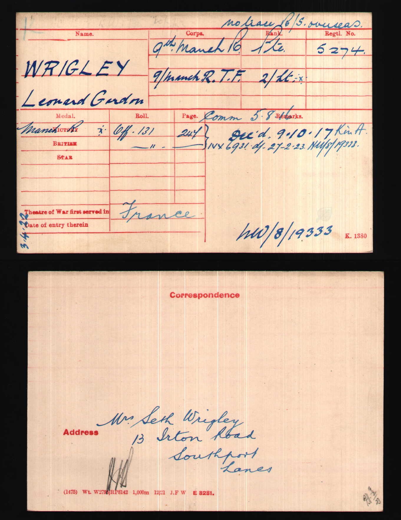 Son of Mr. and Mrs. Seth Wrigley, of 16, Chambres Rd., Southport; husband of Fanny Wrigley (nee Howard), of Southern Rhodesia.