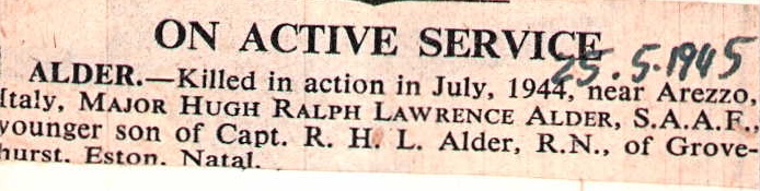 Son of Ralph Herbert Lawrence and Jetta Marjorie (nee Acutt) Alder, of Elandskop, Natal, South Africa. Hugh Ralph Lawrence Alder was born in Durban in March 1919 and had served briefly in the Transvaal Scottish prior to enlisting in the Union Defence Force in May 1940, aged 21 years. Posted to the South African Air Force, he attended a pilot's training course in Rhodesia between December 1940 and July 1941 and was seconded to the Royal Air Force for service with No. 45 Squadron in the Western Desert between October 1941 and January 1942; and afterwards in Burma between February 1942 and December 1943, where he received advancement to Temporary Major. Returning to employment with the S.A.A.F. in the Mediterranean theatre of war in May 1944, Alder joined No. 12 Squadron, a B-26 unit, and was killed in action over the Montevarchi area, Italy on 13 July 1944, when his aircraft was probably involved in a collision which detonated the bomb load. The South African Air Force at War, by Martin Louw and Stefaan Bouwer contains a photograph of this tragic incident. Commemoration stone in Durban (St. Thomas) Churchyard cemetery |
