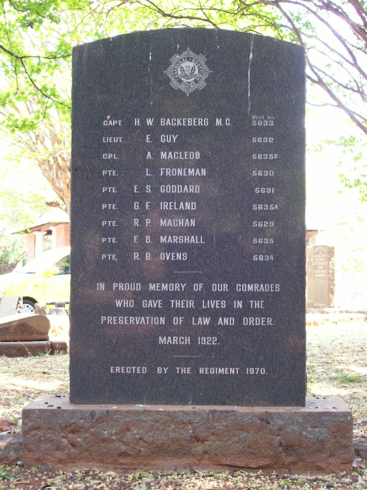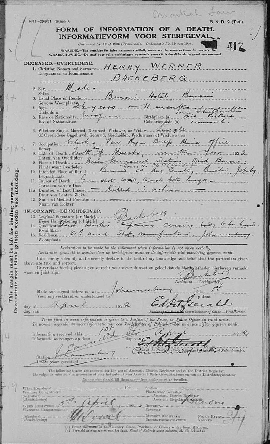 Killed in action, during Rand Revolt |