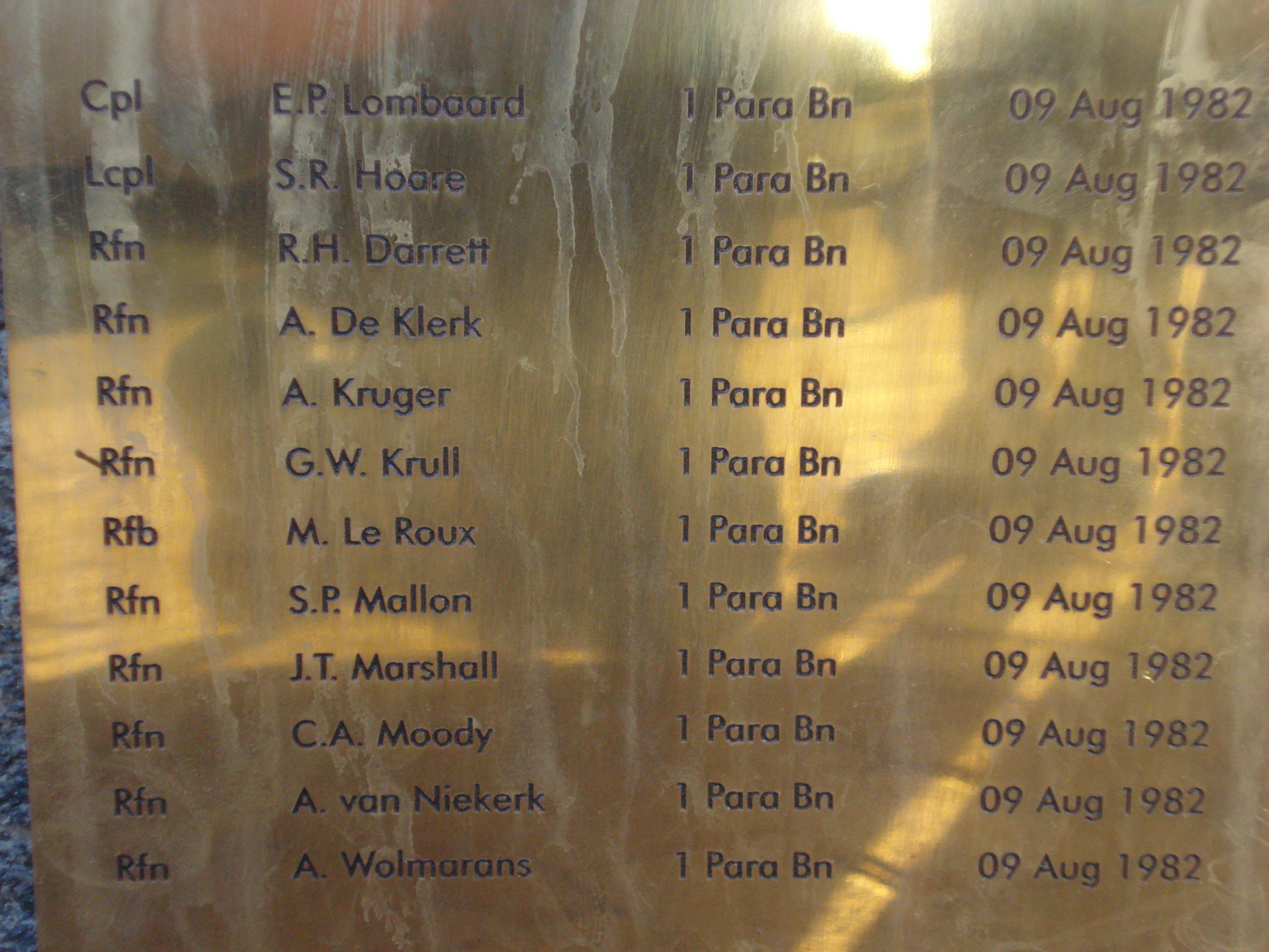 Killed in action, shot down south-east of Cuvelai in Angola, in Aerospatiale SA3330 Puma C #132 together with 11 other soldiers of 1 Para Bn and 3 members of the SAAF.