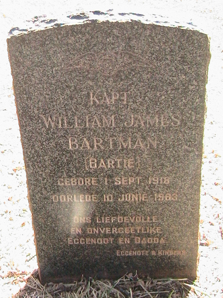 Husband of Anna Jacoba Elizabeth Bartman (nee van der Merwe), of "Estrella", The Willows, Pretoria. Born Cape Province. He had 6 daughters.
