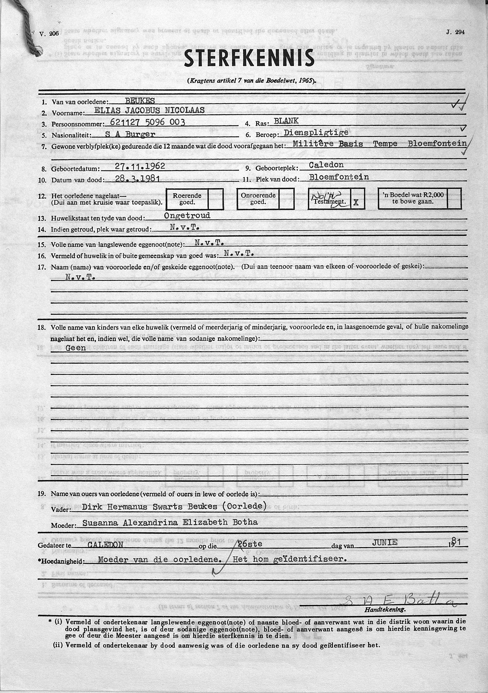 Son of Dirk Hermanus Swarts Beukes and Mrs. Susanna Alexandrina Elizabeth Botha, of Caledon. |