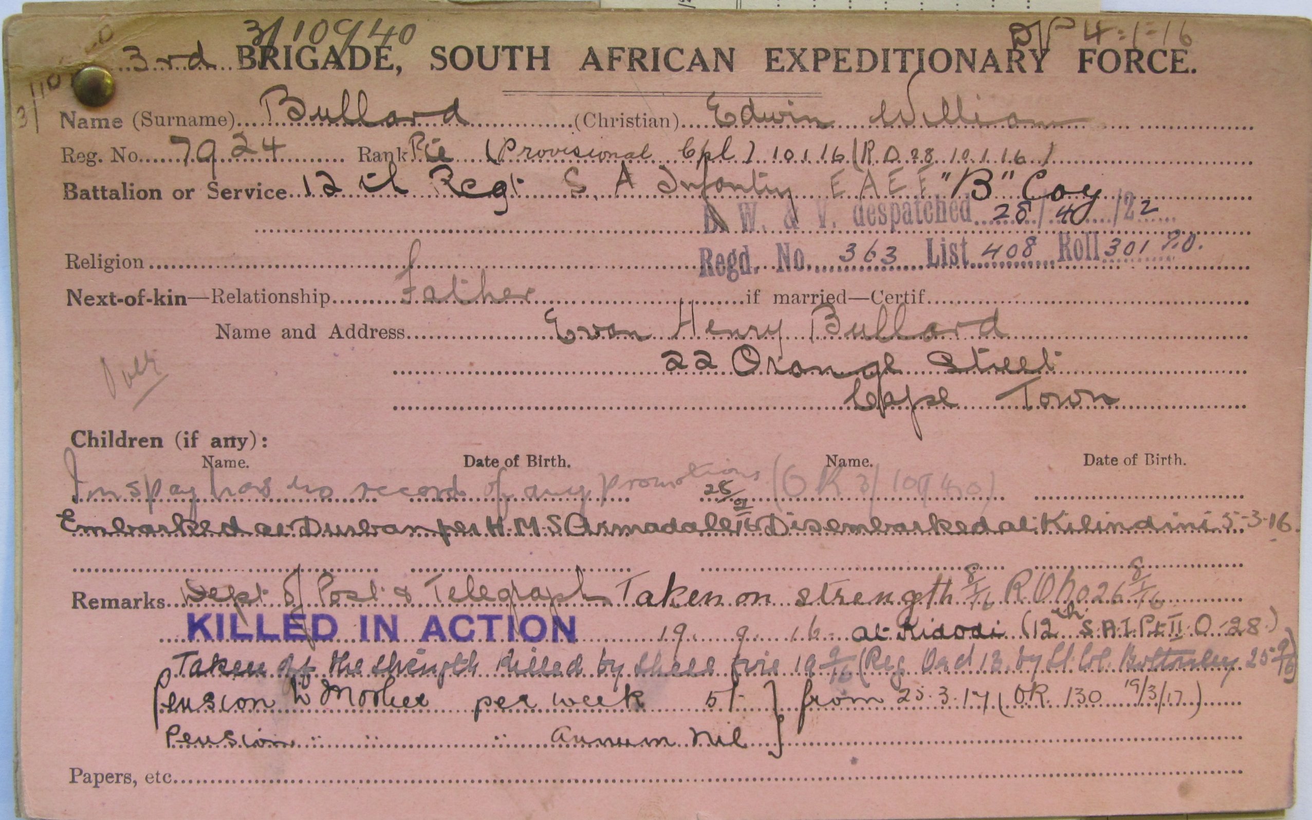 Son of Evan Henry Bullard, of 22 Orange Street, Cape Town |