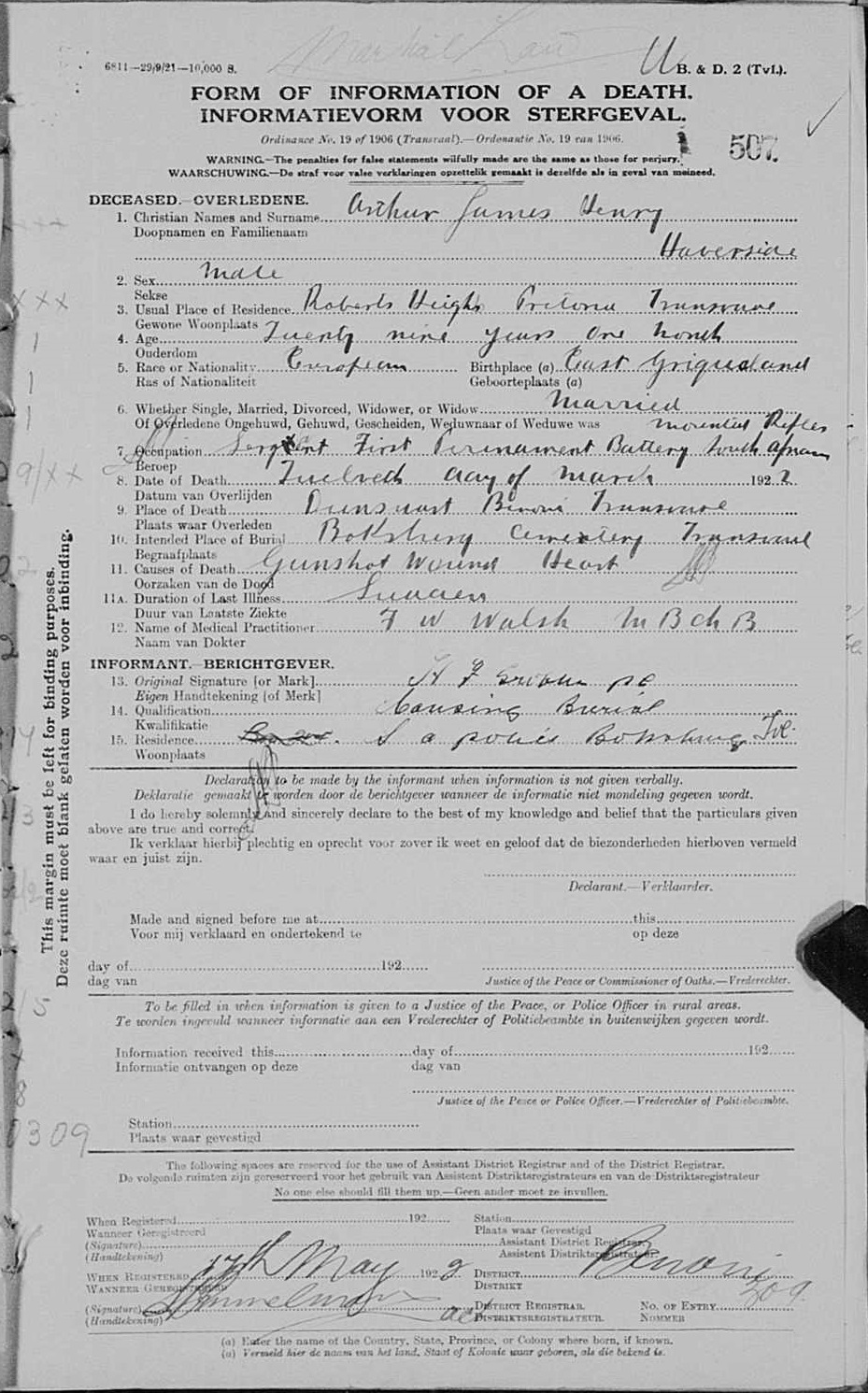 Killed in action, gunshot wound to heart, at Dunswart, Benoni, during Rand Revolt |
