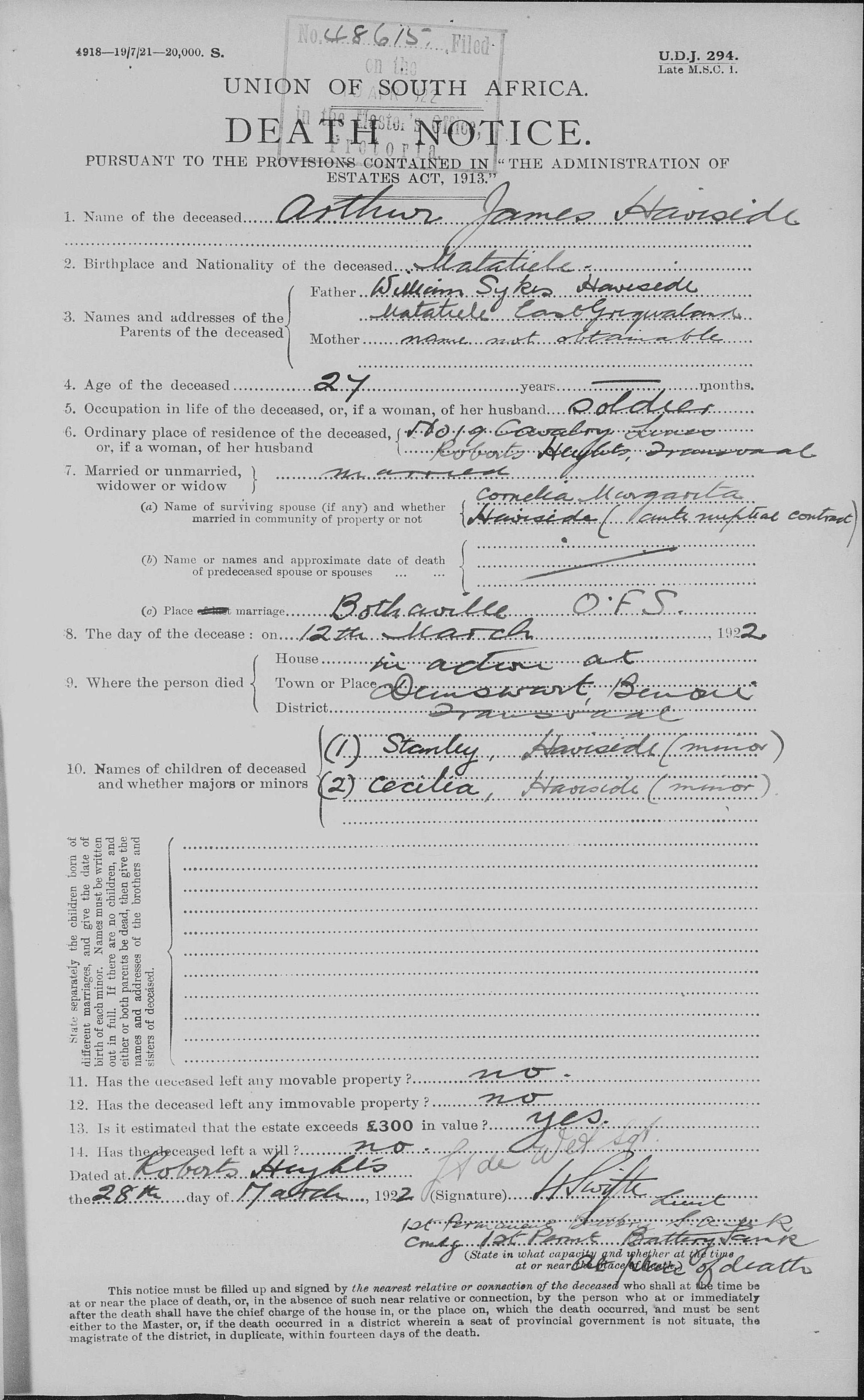 Son of William Sykes Haviside, of Uatatiele, East Griqualand. Husband of Margarita Cornelia (nee Burger) Haviside, of Roberts Heights, Pretoria. Born East Griqualand. |