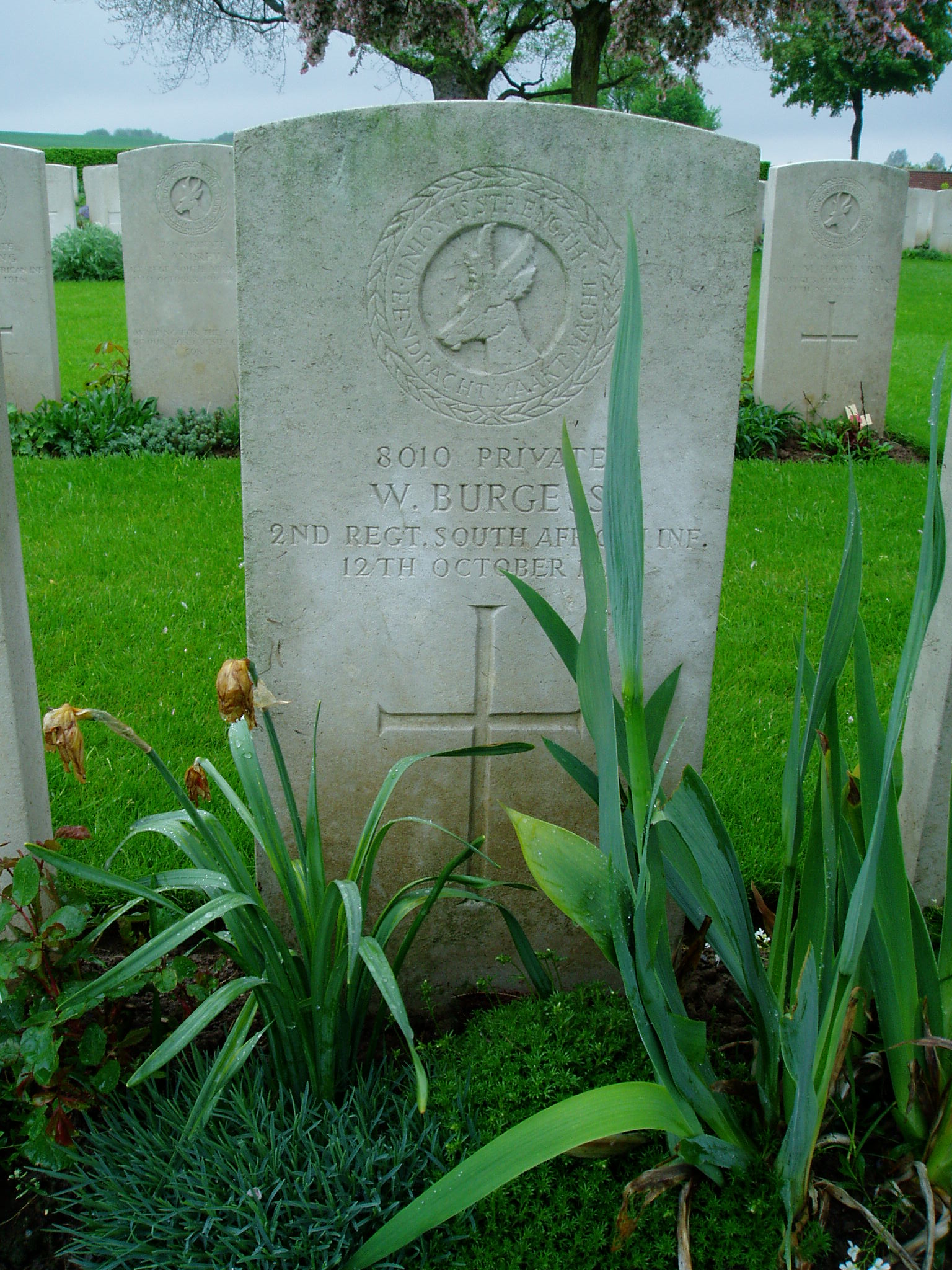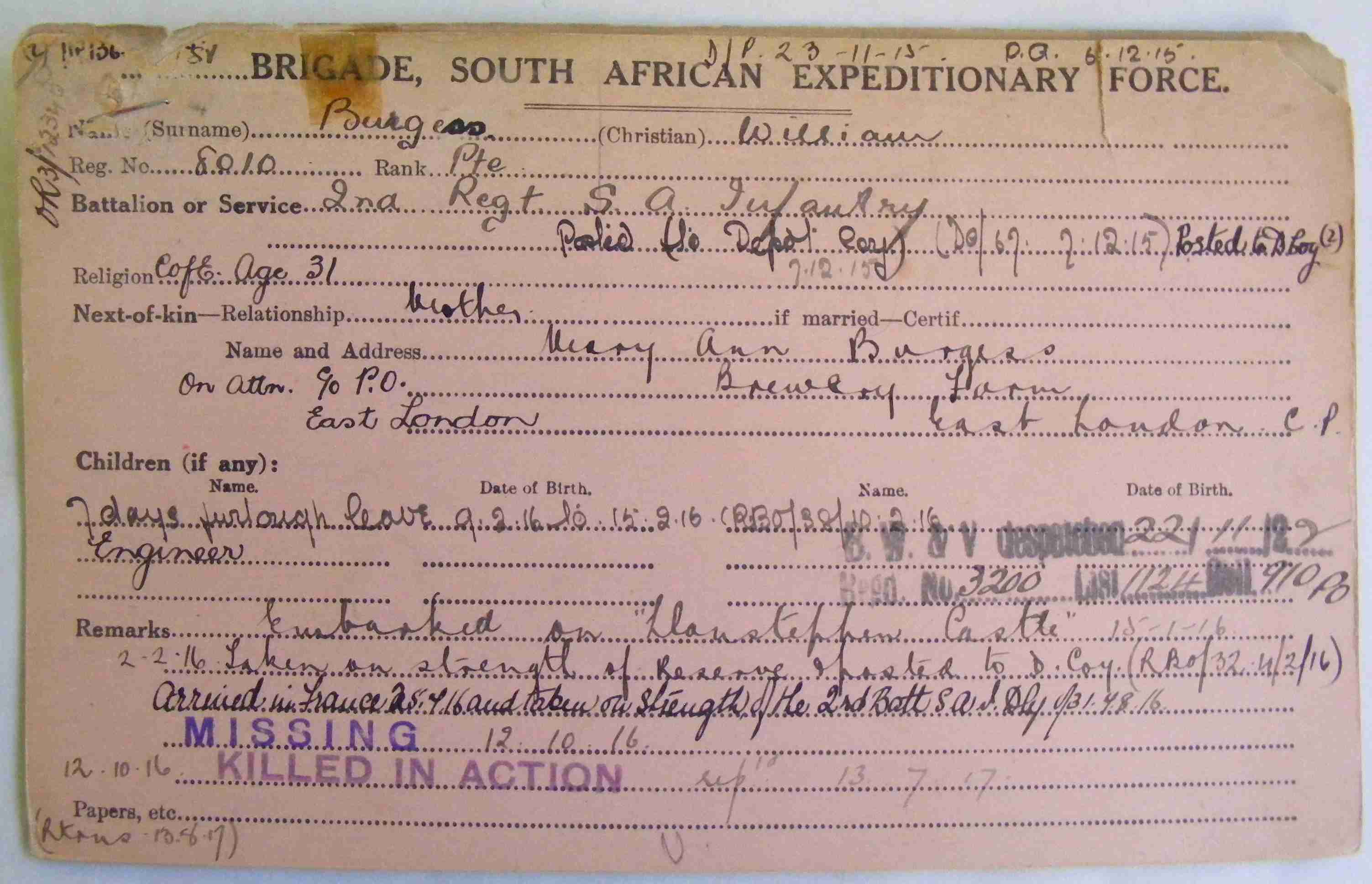 Son of Mr. F. and Mary Ann Burgess, of 31, Moore St., Quigney, East London, South Africa. His brother also died in service. Fought in Delville Wood in July 1916. |
