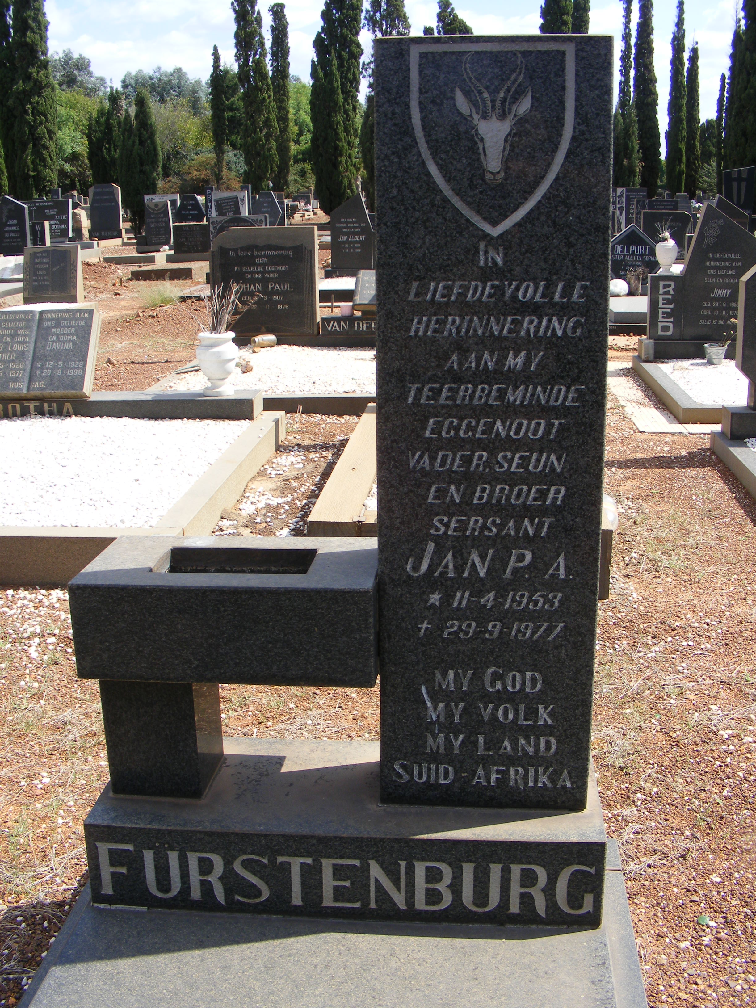 Son of Mr. Johannes Cornelius Furstenburg. ref. "Rhodesian Roll of Honour" by P. Geldenhuys (Roll compiled by Dr. J. R. T. Wood). Amendments from "Rhodesian Combined Forces Roll of Honour 1966-1981", by Adrian Haggett and Gerry van Tonder. |