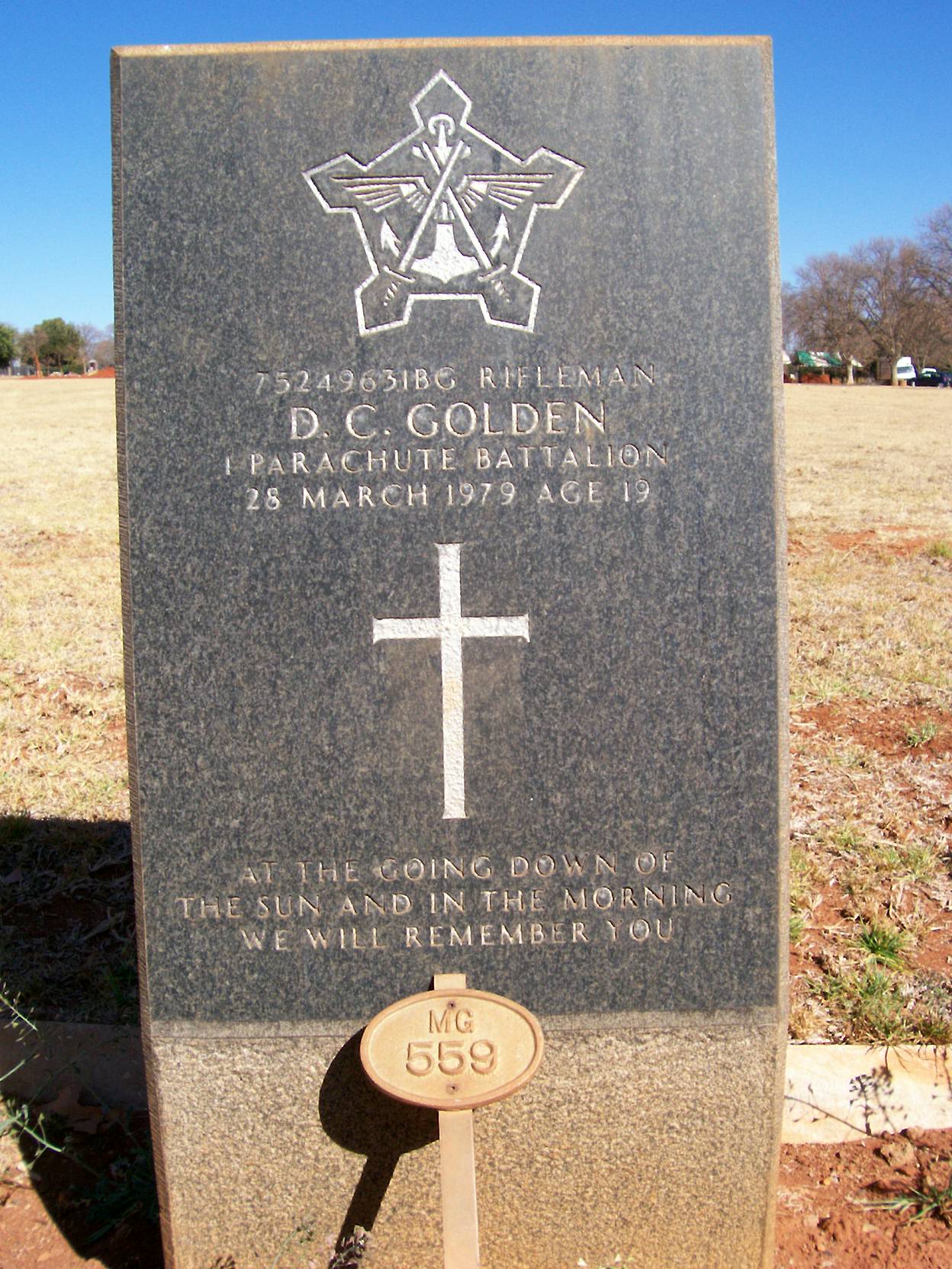 Died in Friendly Fire Incident, at Otavi, shot by own forces. Dennis was the last person in the stick to jump just before sunset and his parachute drifted further away than the rest. After a Temporary Base had been set up, it was only after dark that Dennis came walking along and unfortunately, a Paratrooper mistook him for an enemy insurgent who were known to be operating in the area at the time and everyone opened fire in his direction. At first light the following morning, a sweep of the area was conducted and his body was located and subsequently recovered. |