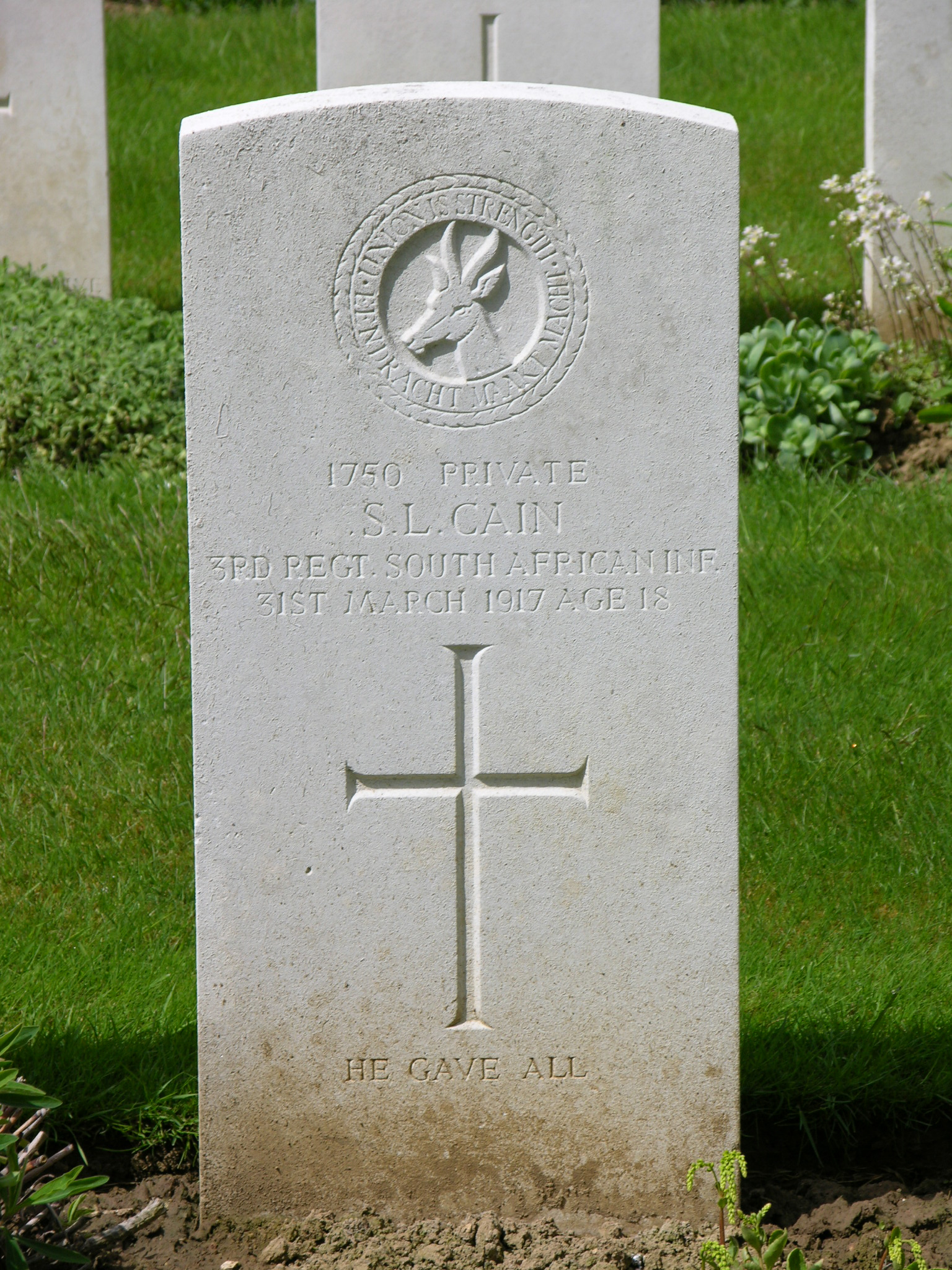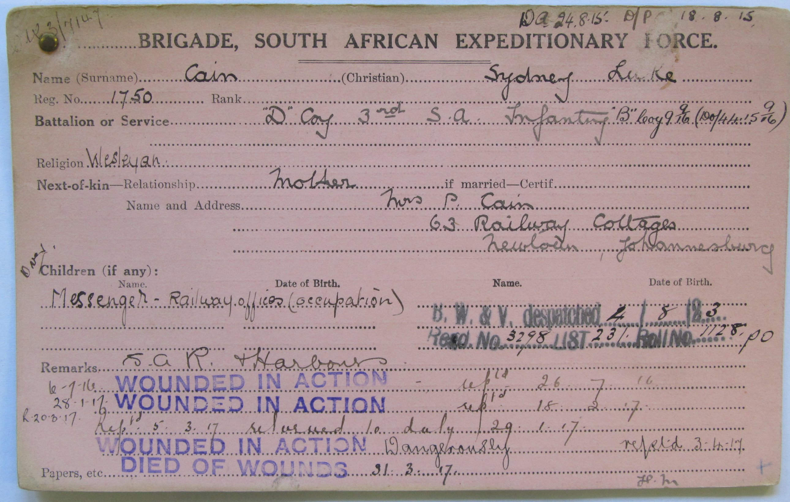 Son of Luke Andrew and Phoebe Ann Cain, of 63, Railway Cottages, Newtown, Johannesburg. Native of Aldershot, England.