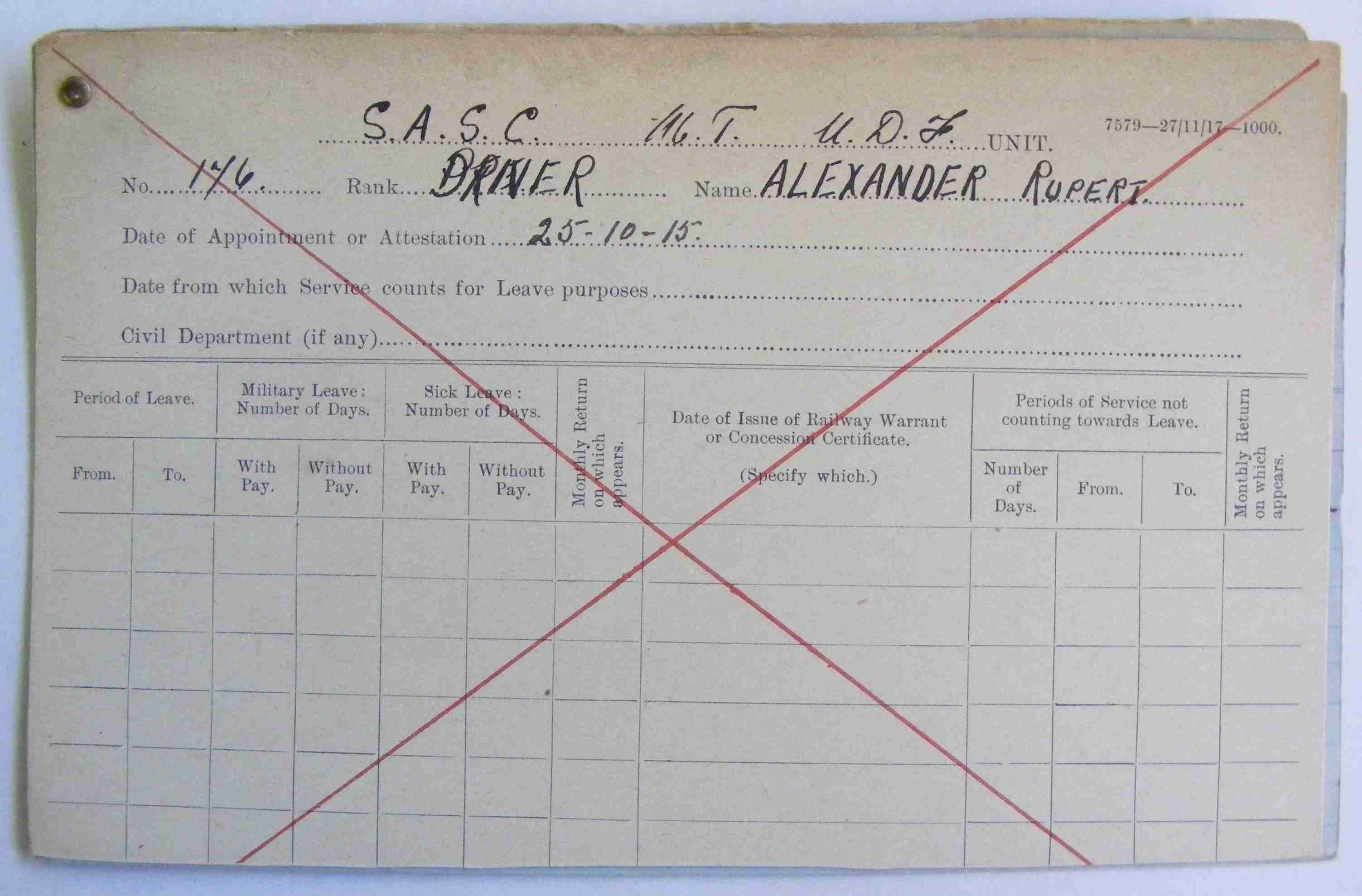 Son of Arthur Stavely and Magdalena Wilhelmina Alexander. Husband of Carmen Alexander, of Port Louis, Mauritius. Born Donderboschfontein, Barkly West, Cape Province. A miner. |