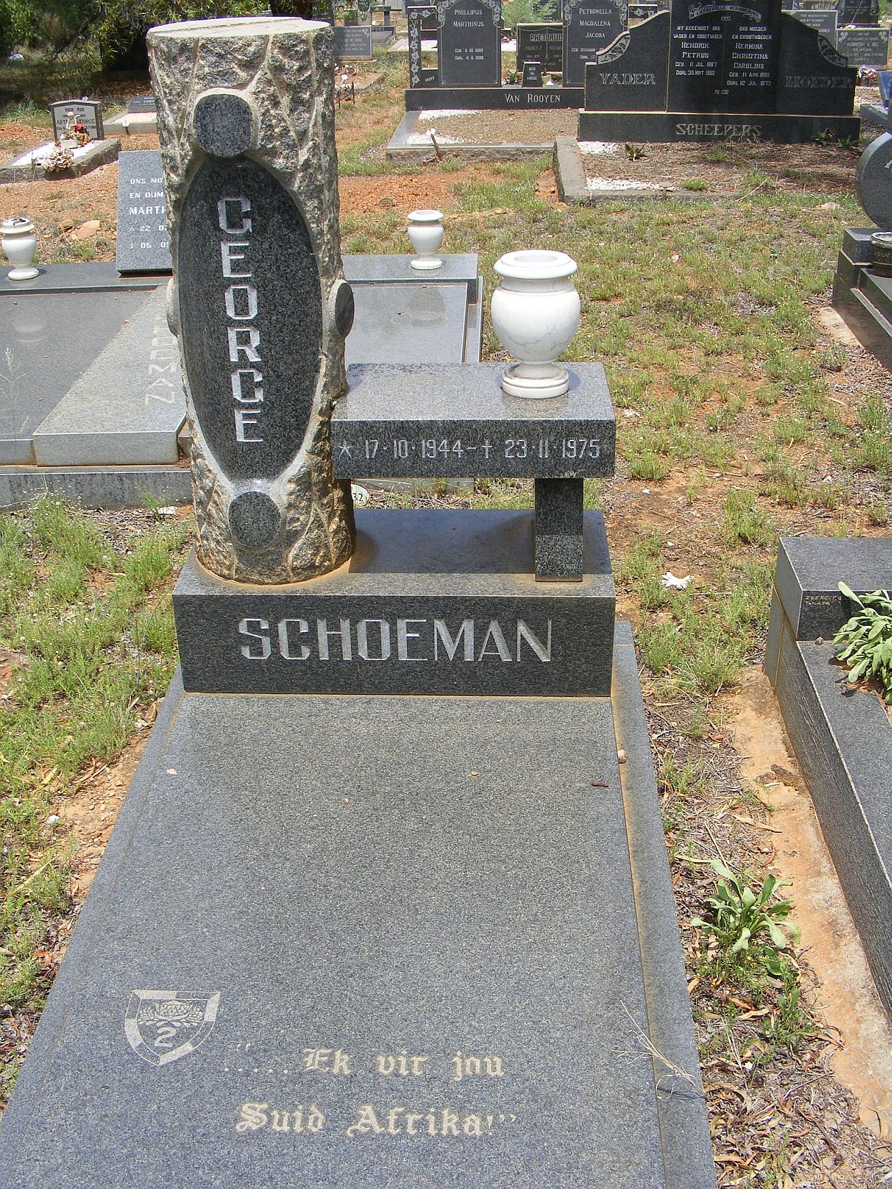 Son of Mrs. R. Schoeman. Husband of Hester Hendrina Schoeman (nee Rohrbeck) |